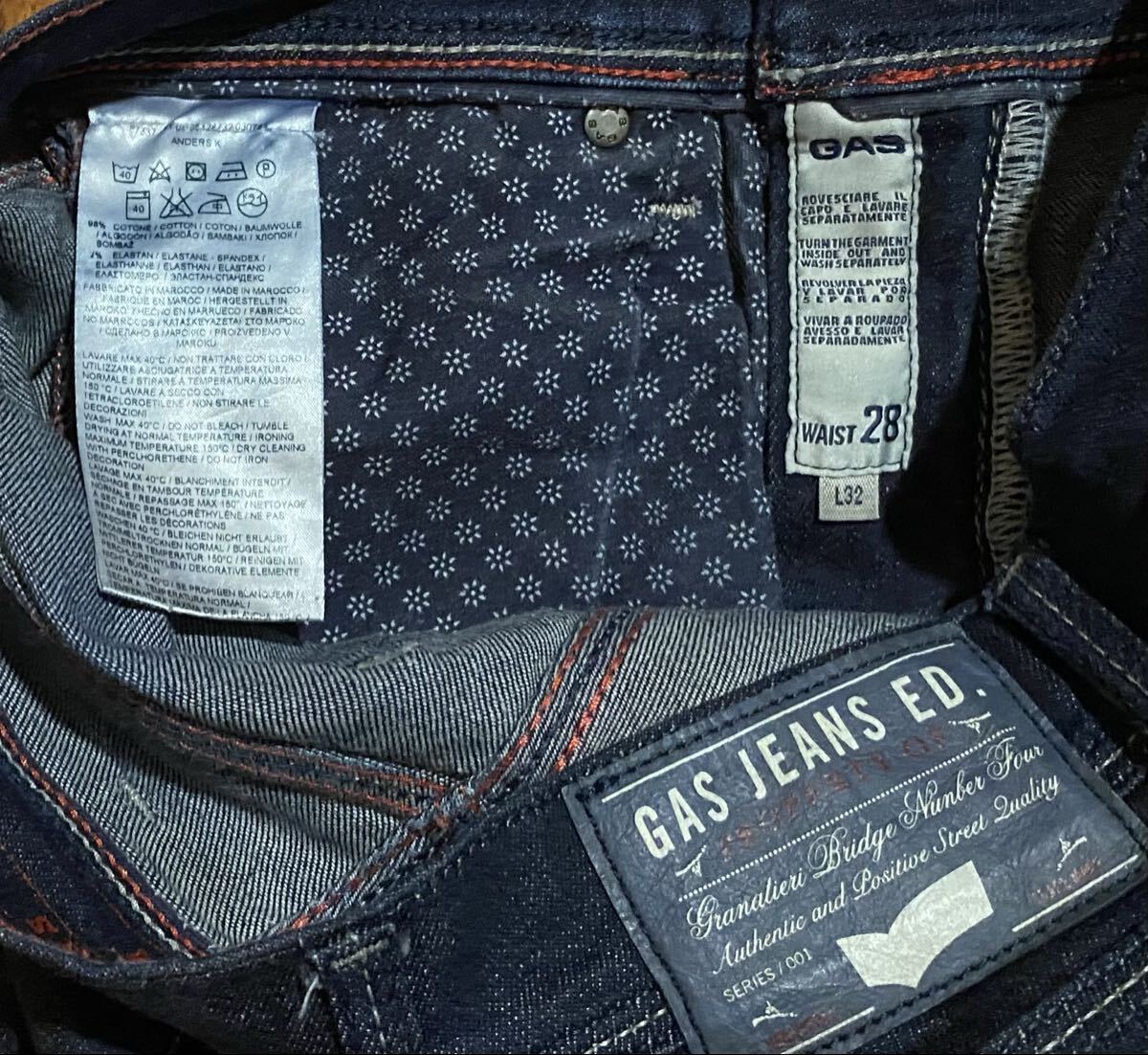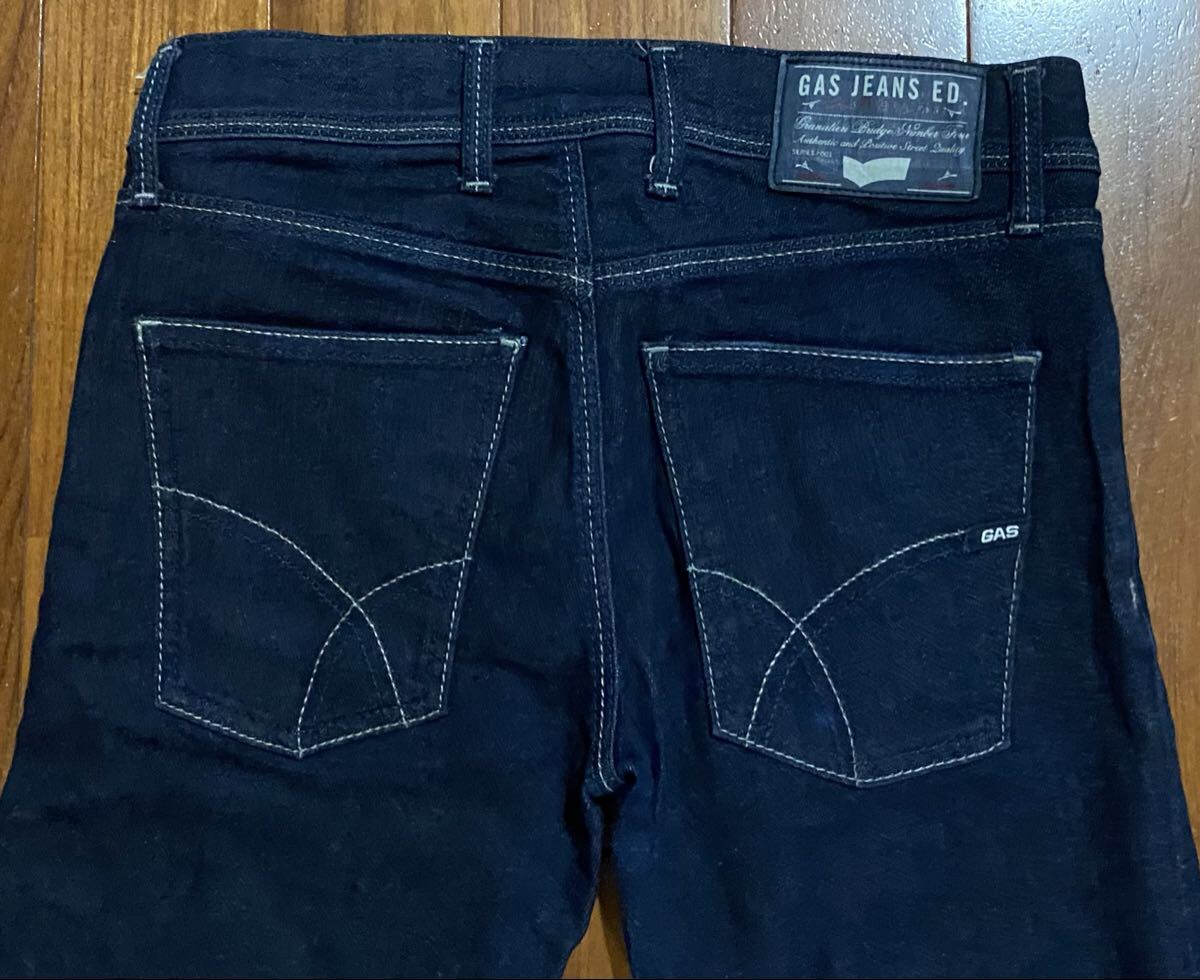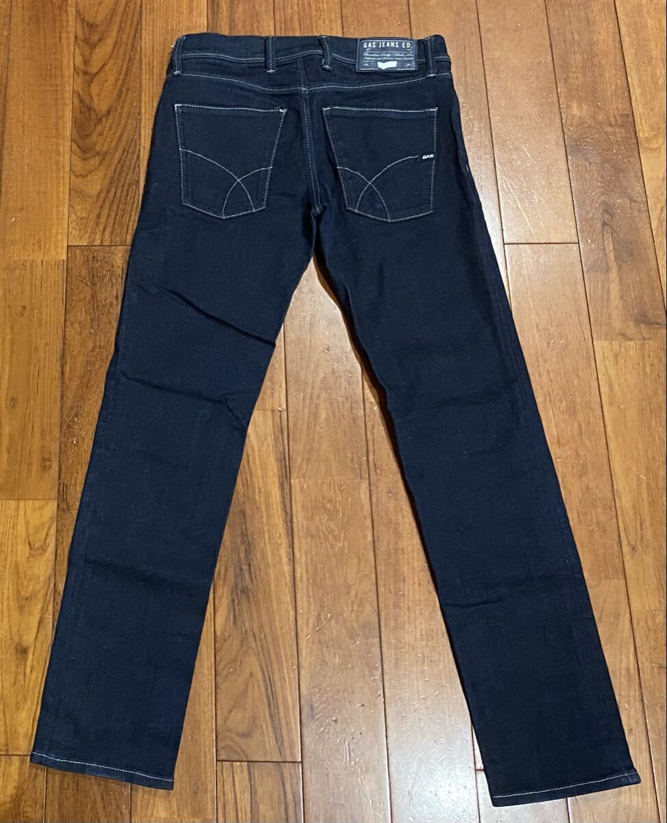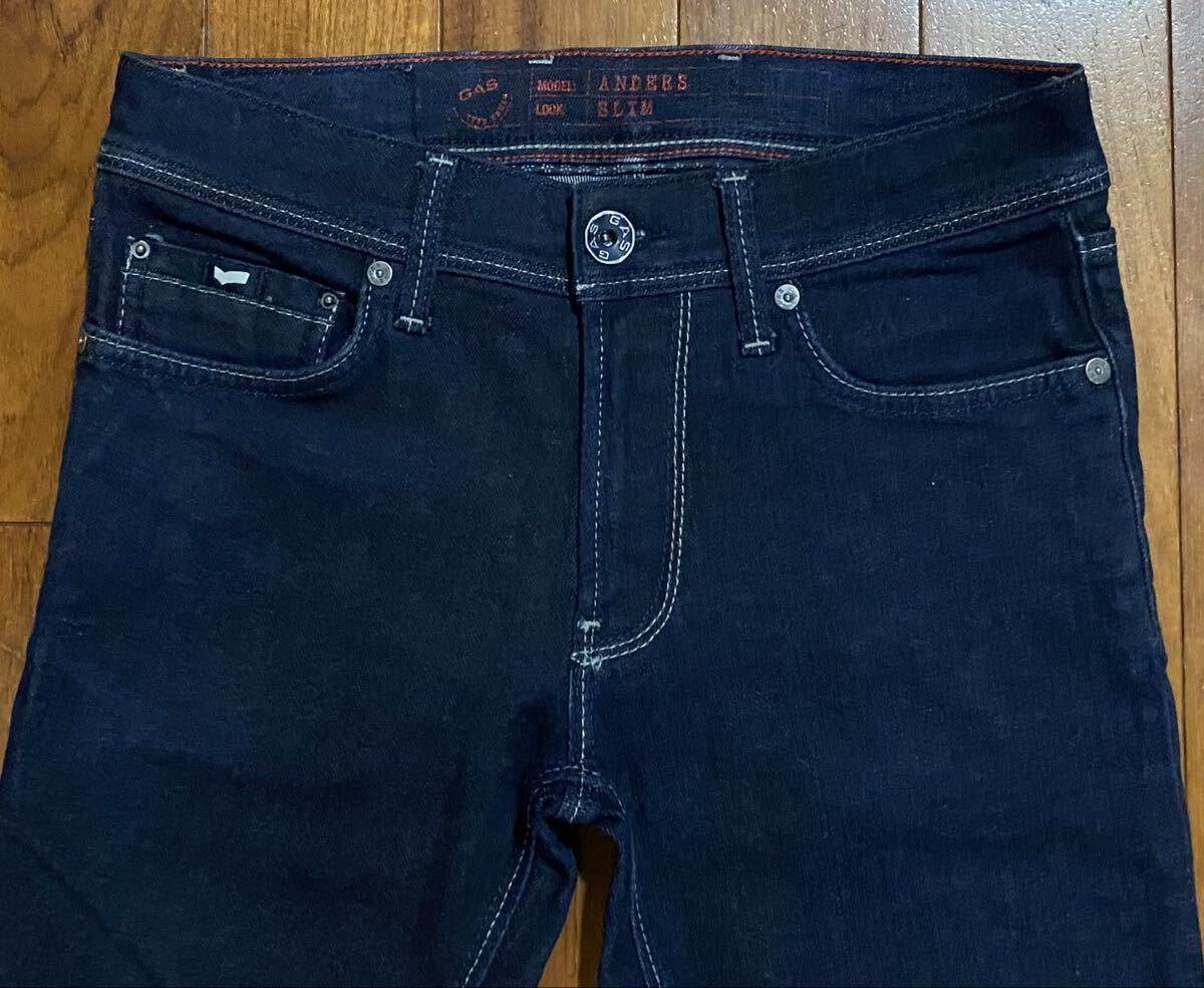 ガスのストレッチデニム(ジーンズ)、ANDERS K SLIMです。色はインディゴブルーです。USEDで裾直ししておりますが状態は良いです(10段階中8程度)。生地はストレッチ入りで綿98%、ポリウレタン2%です。紙パッチ、ジッパーフライです。正規品です(GAS JAPAN(株)、モロッコ製)。サイズはW28でウエストは重ねずに平置きで約71cm、ヒップ約84cm、股上約22cm、股下約70cm、股下15cmのふともも部分約42cm、裾まわり約30cm、重量約470gです。発送はゆうパケットポストになります。