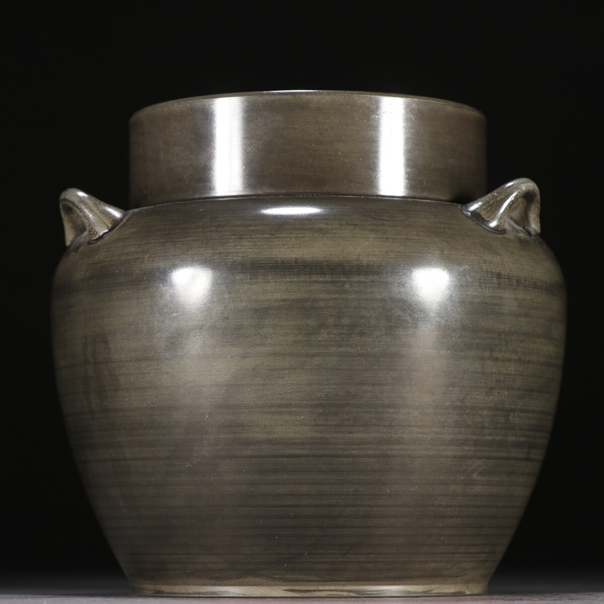「錫胎彫 三耳 茶葉罐 在銘 時代物」極細工 置物擺件 茶道具 古賞物 古美術 旧蔵出