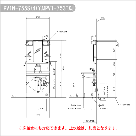 ■ 洗面化粧台部:PV1N-755S(4)Y