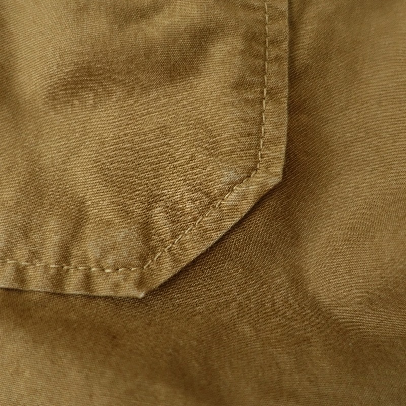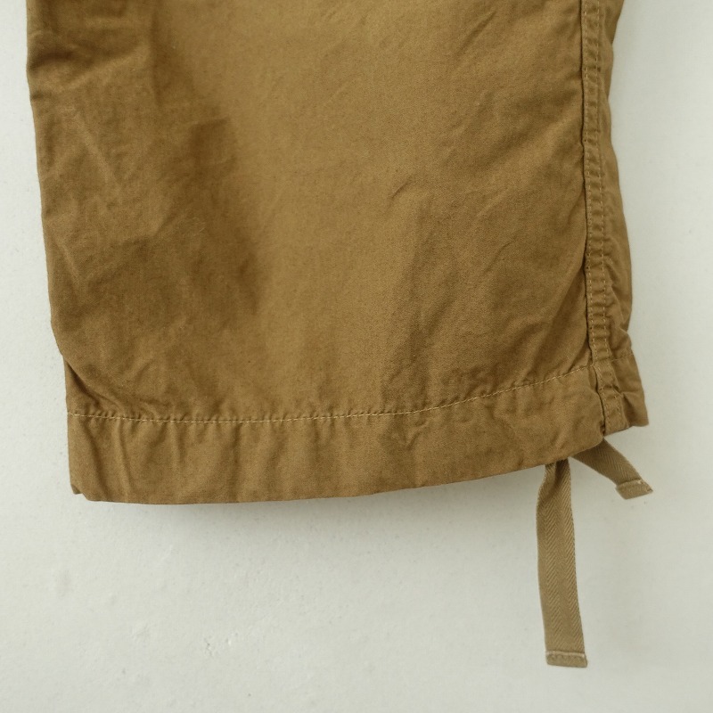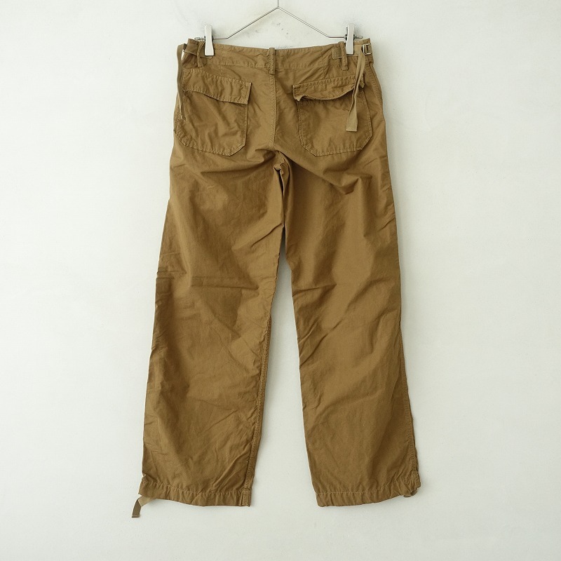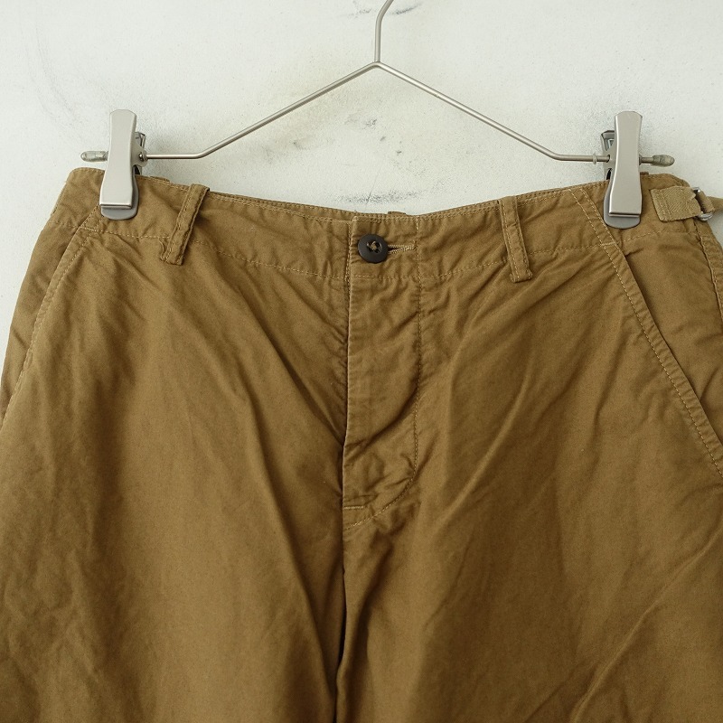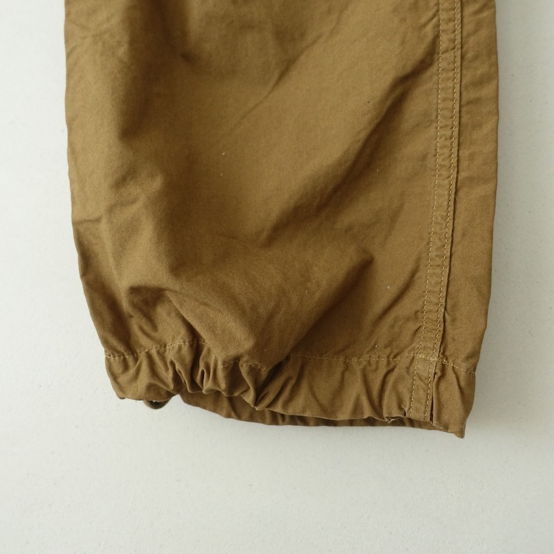n100のコットンポプリンアーミーパンツです。カラーは製品染めのモカベージュです。程よいハリ・コシ・艶のある高密度に織りたてられた薄手のコットンポプリン生地を使用。透け感はございません。前立てはボタンフライ、ウエストはベルトループ&アジャストベルト付き。裾は紐入りです。ヒップにフラップポケット、前両腰にハンドポケットがございます。 |