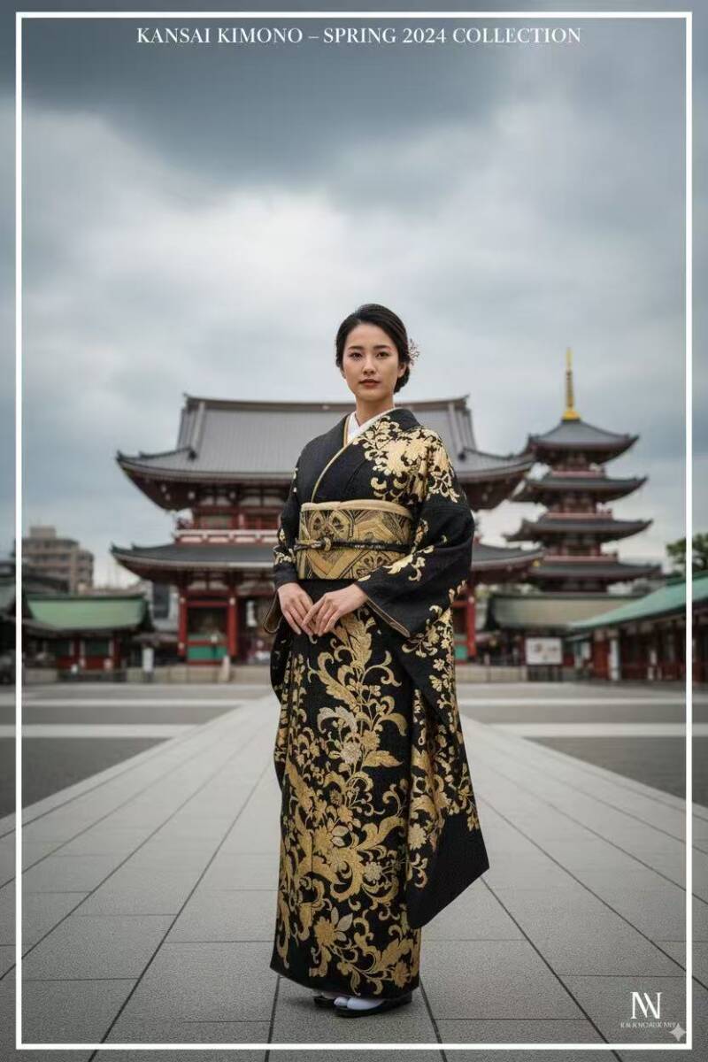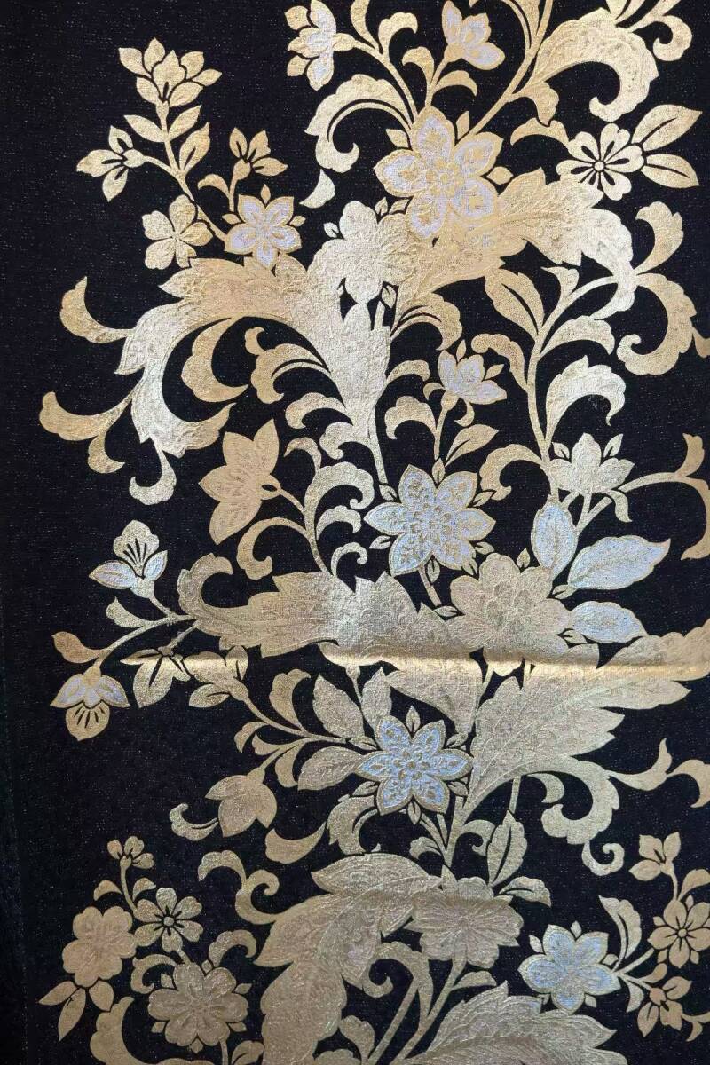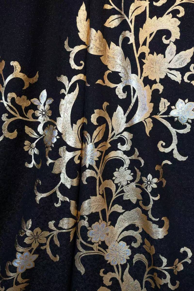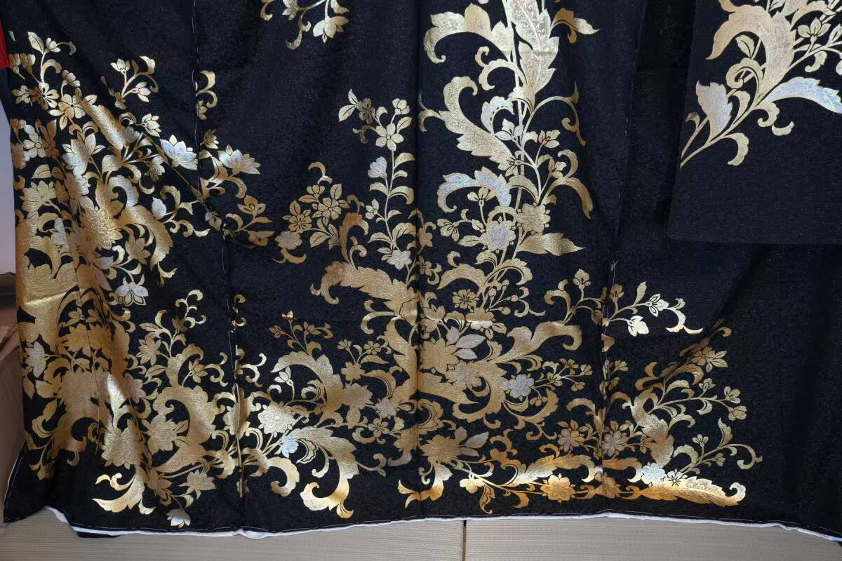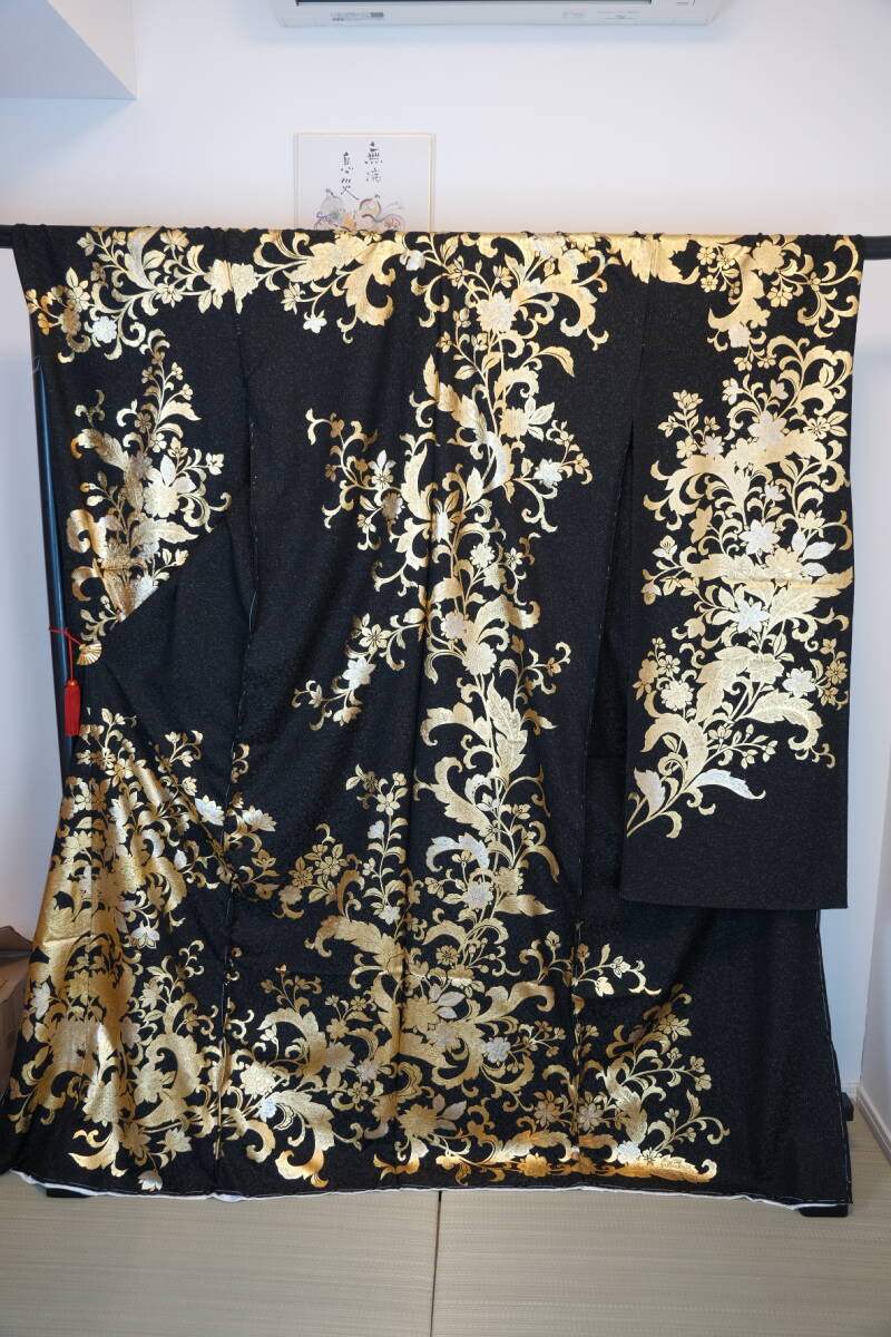 黒地に映える豪華な金彩模様が目を引く、格式高い振袖です。全体にあしらわれた金の花柄は、優雅で華やかさを演出し、特別な日の装いにふさわしい逸品です。動くたびに上品な輝きを放ち、見る人の心を惹きつけます。