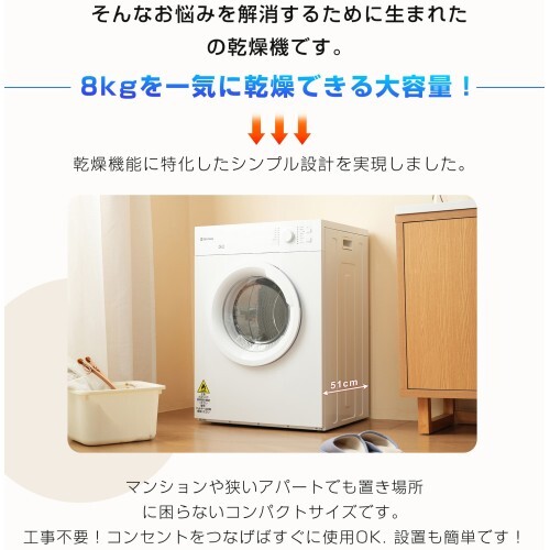 ホワイト 衣類乾燥機 8kg 自動モード 乾燥機 8キロ 衣類 大型 ドラム 家庭用 プログラムノブ操作 タイマー 高温除菌 梅雨対策