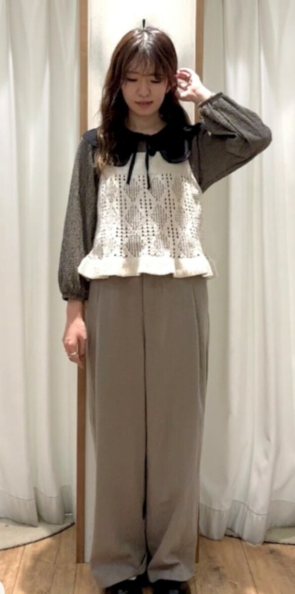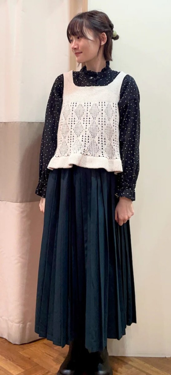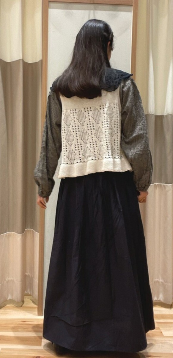 レースのような透かし編みが可愛らしいニットビスチェ。ふわもこなモールヤーンで仕立てられており、ソフトであたたかな風合いなのも魅力です。裾のふんわりとしたフリルもスタイリングに甘さをプラス◎ブラウスやカットソーなどと合わせて、様々なレイヤードスタイルが楽しめるアイテムです。