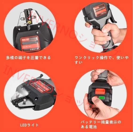 電動圧着機 ダイス6個付き 電動圧着ペンチ 裸端子 絶縁被覆端子 フェルール圧着工具 バッテリー2個付き