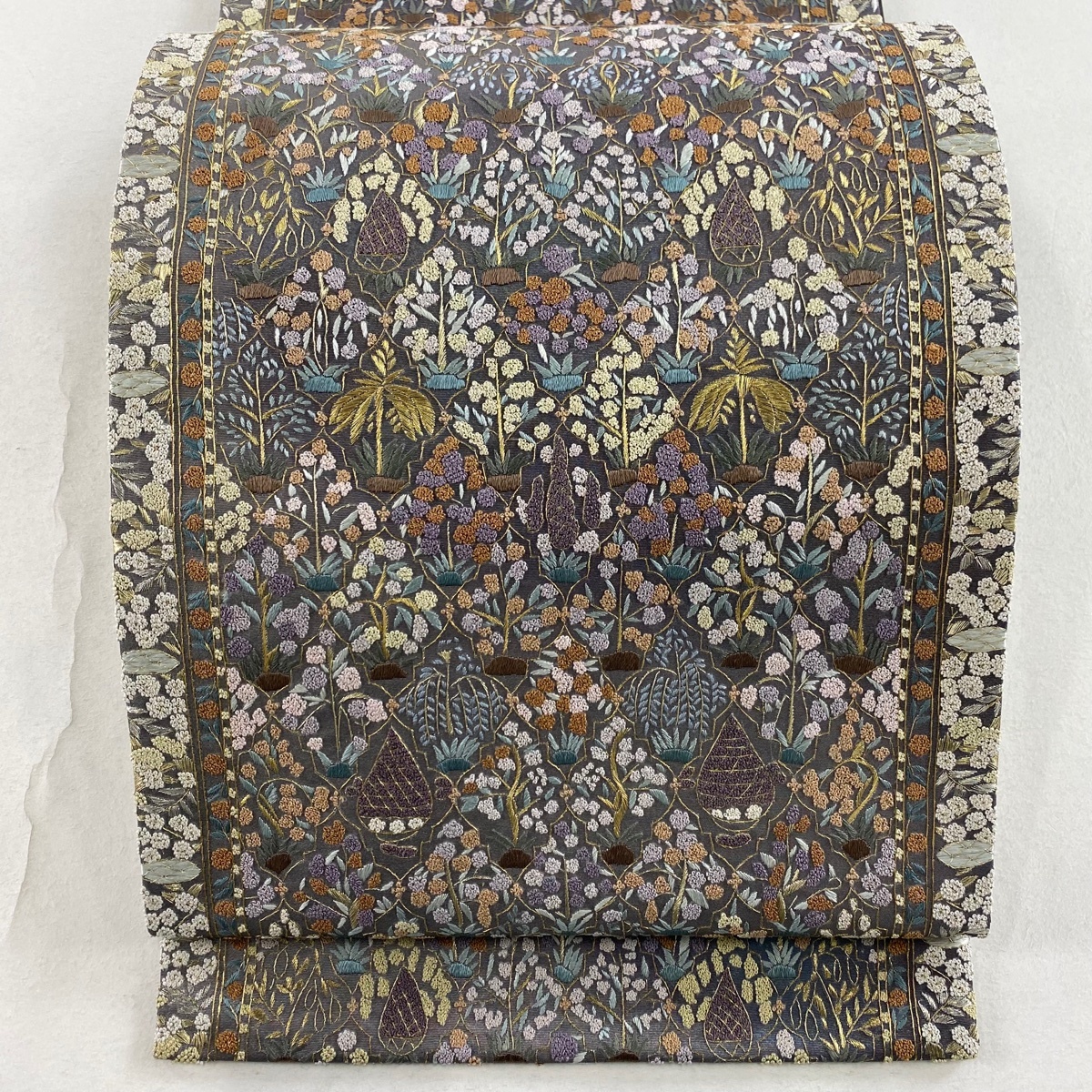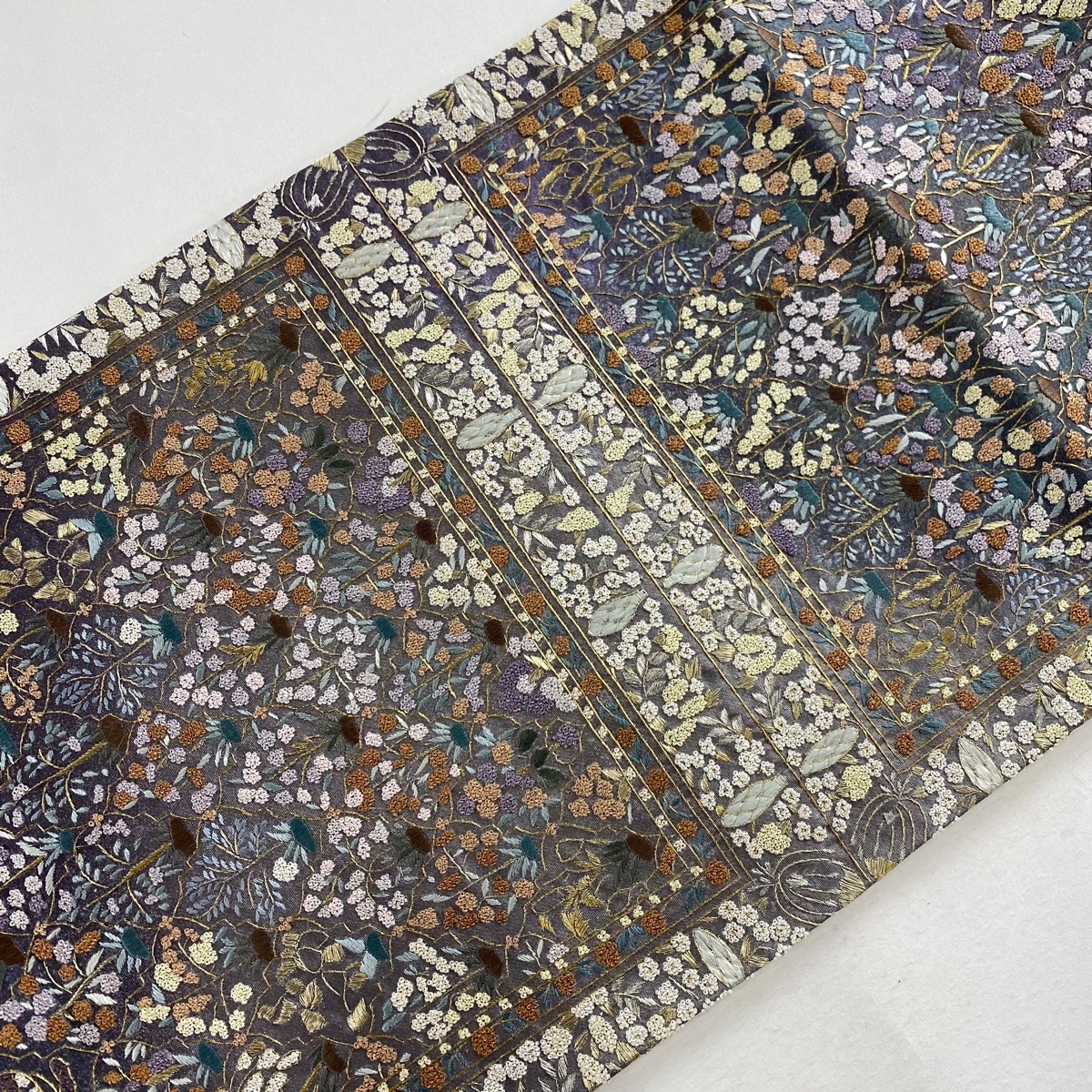 | 袋帯 美品 逸品 草花 樹木 相良刺繍 金銀糸 灰紫 六通 正絹 【中古】 |