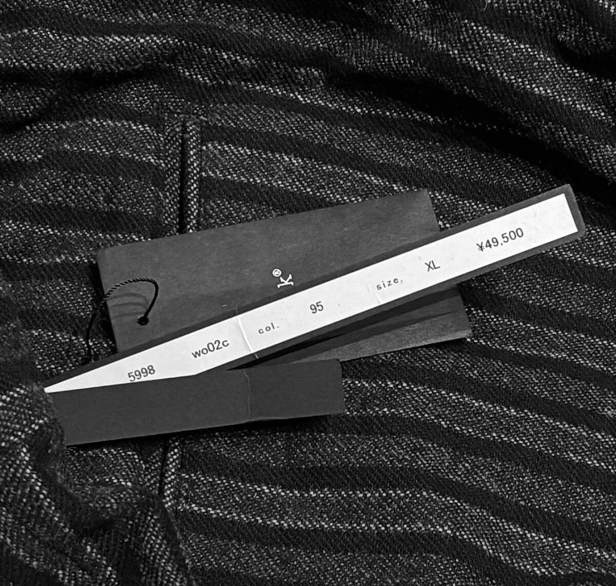 定価49500円。新品、サイズXL、ウエスト82cm、股上38cm、股下73cm、裾幅17cm。