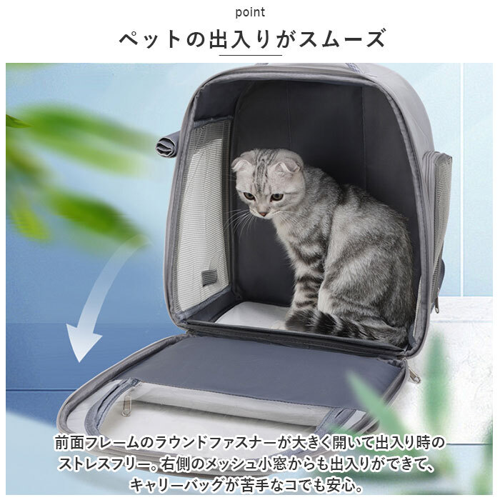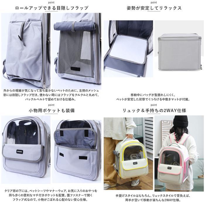 | 商品説明 | ・・ペットの様子がひと目でわかる、クリアウィンドウ付き!お出掛けに便利な「リュック型ペットキャリー」が新登場。 ・【通気性の高い安心構造】 ・リュックの両サイドに大きなメッシュ窓を配置することで通気性をしっかりと確保。蒸し暑さの気になる季節も風がフワッと通って快適。 ・【ペットの出入りがスムーズ】 ・前面フレームのラウンドファスナーが大きく開いて出入り時のストレスフリー。右側のメッシュ小窓からも出入りができて、キャリーバッグが苦手なコでも安心。 ・【ペットの様子が見えて安心】 ・リュック正面にクリア素材でできた透明窓を設けた可愛らしいデザイン。中のペットからもクリアウィンドウ越しに外が眺められるから、人見知りのワンちゃん・ネコちゃんもリラックス。 ・【ペットが落ち着くクリア窓】 ・クリアウィンドウはラウンド型ファスナーで開閉可能。外出先でペットにおやつをあげたり、ネコちゃんの頭を撫でで安心させてあげたいときに便利。 ・【ロールアップできる目隠しフラップ】 ・外からの視線が気になって落ち着かないペットのために、左側のメッシュ窓には目隠しフラップ付き。使わない時にはフラップをクルクルと丸めて、バックルベルトで留めておける仕組み。 ・【姿勢が安定してリラックス】 ・移動中にバッグが型崩れしにくく、ペットが安定した状態でくつろげる中敷きマットが付属。 ・【小物用ポケットも装備】 ・クリア窓の下には、ペットシーツやマナーウェア、お気に入りのおやつを持ち歩くの便利なマチ付きポケットを配置。面ファスナーで開くフラップ式なので、小物がこぼれる心配のない安心仕様。 ・【リュック&手持ちの2WAY仕様】 ・手提げスタイルはもちろん、リュックスタイルで背負えば、両手が空いて移動が楽ちんな2WAY仕様。 ・【飼い主さんにも優しいメッシュパッド】 ・背中部分とショルダーベルト裏面は快適なメッシュクッションで仕上げ、飼い主さんの身体への負担も優しく軽減。 ・【使わないときはコンパクトに】 ・底面の中敷きマットを取り外し、リュックを前後にパタンッと圧縮すれば、場所を取らずにコンパクトに収納可能。 |