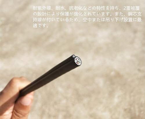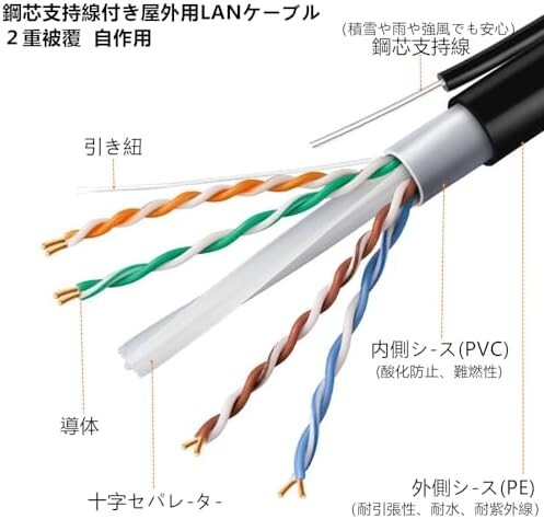 • 通常のLANケーブルの上に、耐候性のある屋外被覆の乗った2重被覆のケーブルで、鋼芯支持線が付いております。(積雪や雨や強風でも安心)