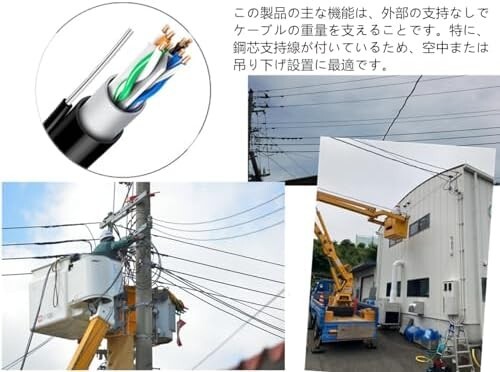 屋外用LANケーブル,UTP-カテゴリ6(CAT6)の規格。PoE対応。導体径約0.5mm×4P。単線仕様。支持線材質/鋼芯