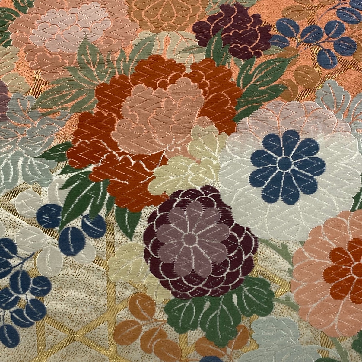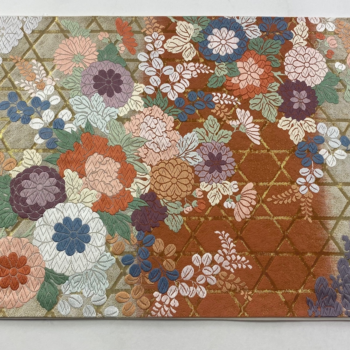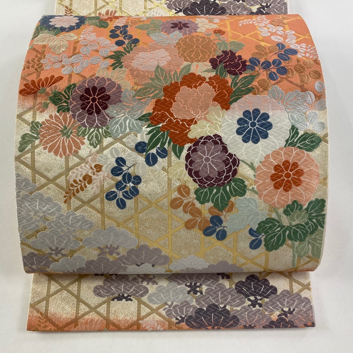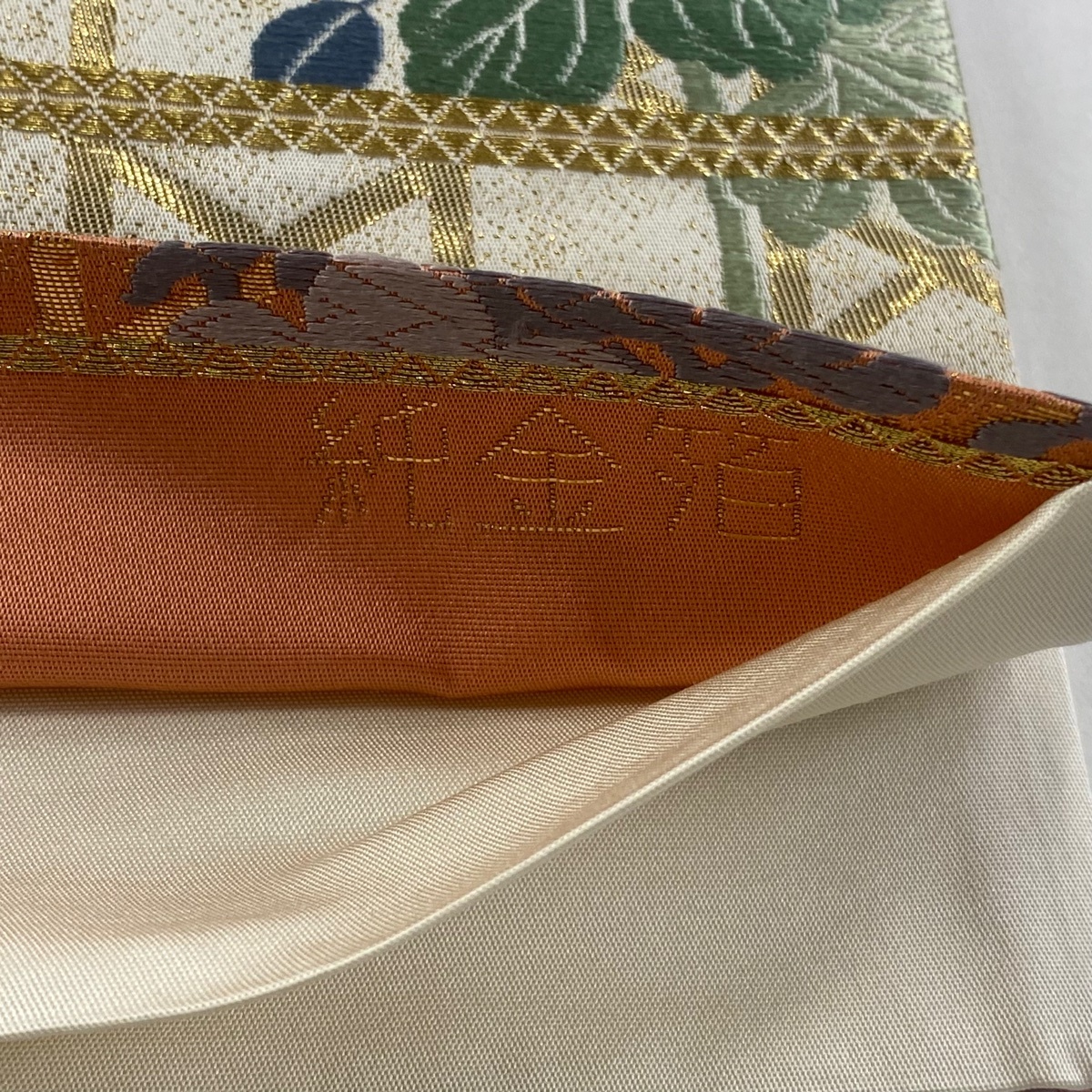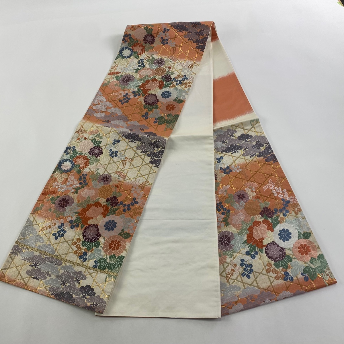 | 袋帯 美品 秀品 草花 籠目 唐織 純金箔 クリーム 六通 正絹 【中古】 |