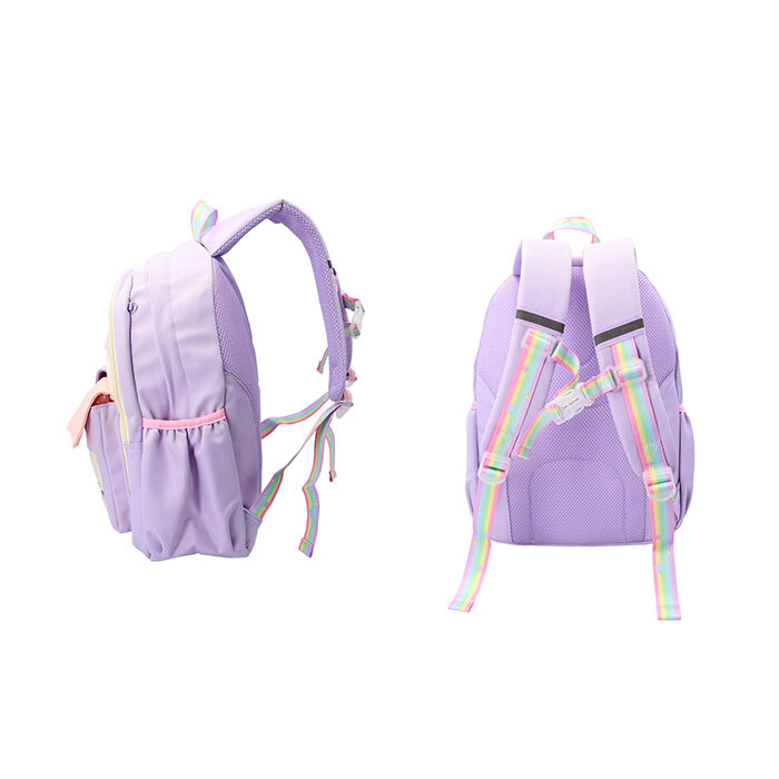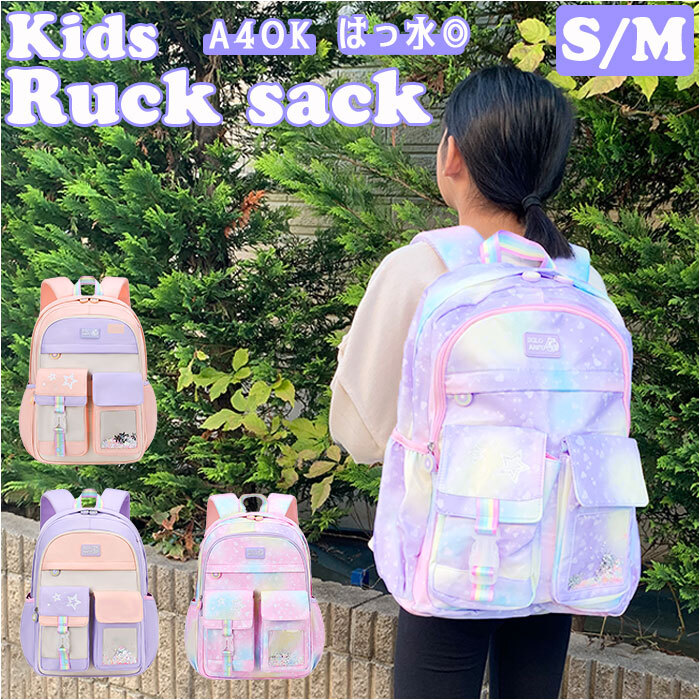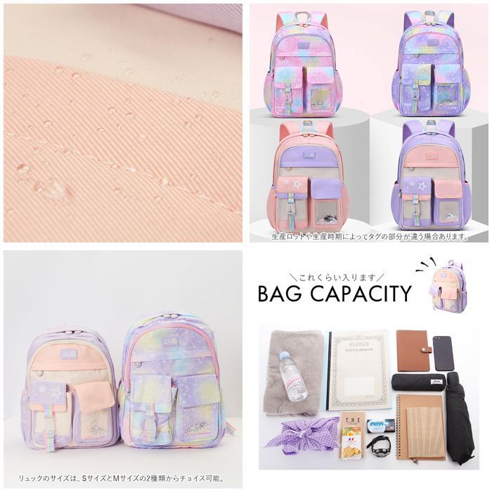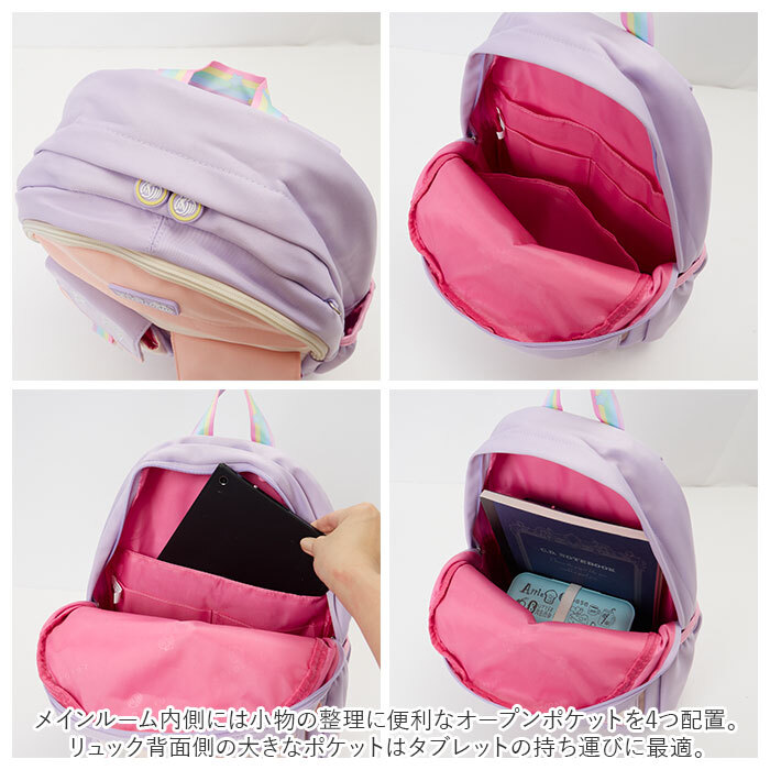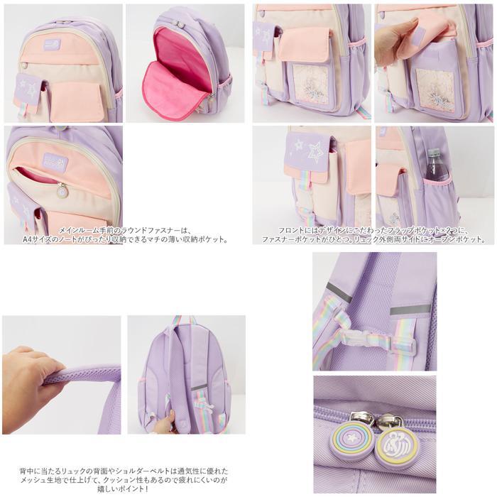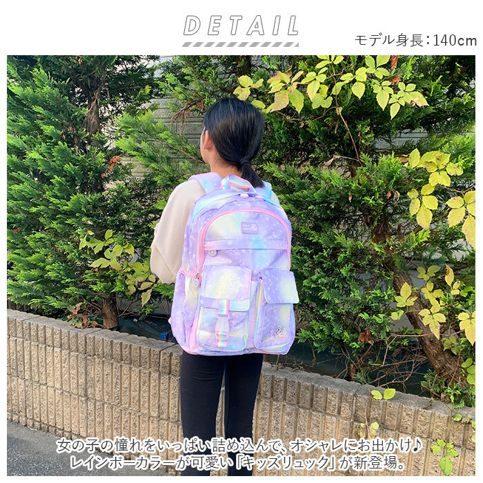 商品説明 | ・・女の子の憧れをいっぱい詰め込んで、オシャレにお出かけ♪レインボーカラーが可愛い「キッズリュック」が新登場。 ・メインルーム開口部は左右どちらからも開けやすいダブルファスナーを採用。側面まで大きく開いて、小物の出し入れがスムーズ。 ・リュックのサイズは、SサイズとMサイズの2種類からチョイス可能。A4サイズに対応したSサイズは低学年の女の子に。高学年のお姉さんになったら、さらに収納力たっぷりのMサイズがオススメ! ・程よいマチ幅のあるメインルームには、教科書やノートはもちろん、ランチボックスもすっぽり入って遠足やピクニックでも大活躍。 ・メインルーム手前のラウンドファスナーは、A4サイズのノートがぴったり収納できるマチの薄い収納ポケット。 ・メインルーム内側には小物の整理に便利なオープンポケットを4つ配置。リュック背面側の大きなポケットはタブレットの持ち運びに最適。 ・フロントにはデザインにこだわったフラップポケット×2つに、ファスナーポケットがひとつ。スマホやペンケースなど、頻繁に取り出す小物の収納にぴったり! ・リュック外側両サイドのオープンポケットは、水筒や折りたたみ傘がすっぽりと収まるサイズ感。 ・背中に当たるリュックの背面やショルダーベルトは通気性に優れたメッシュ生地で仕上げて、クッション性もあるので疲れにくいのが嬉しいポイント! ・色鮮やかなパステル生地に、スパンコールがキラリと輝くクリアポケットなど、女の子の夢をかなえたカラーバリエーション。姉妹お揃いでリンクコーデもOK! |