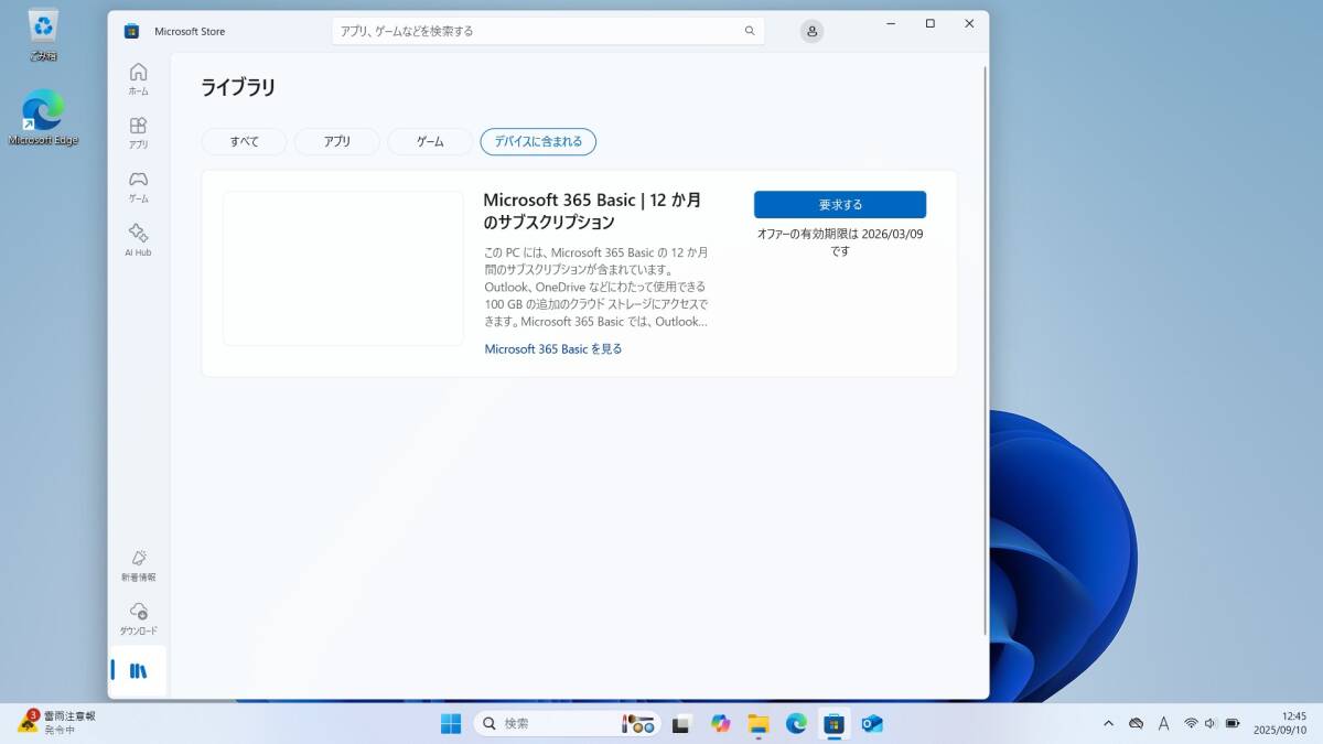 インストールされていません(Officeプロダクトキーは付属しておりません) ※Microsoft Storeには、このデバイスに「Microsoft 365 Basic|12か月のサブスクリプション」が含まれていると表示されていますが、利用可能かどうかの確認は行っておりません(サポート対象外)。 |
