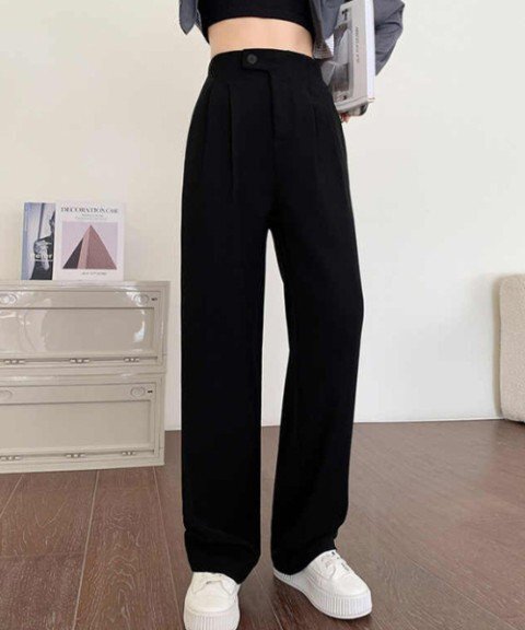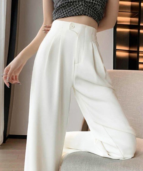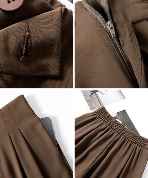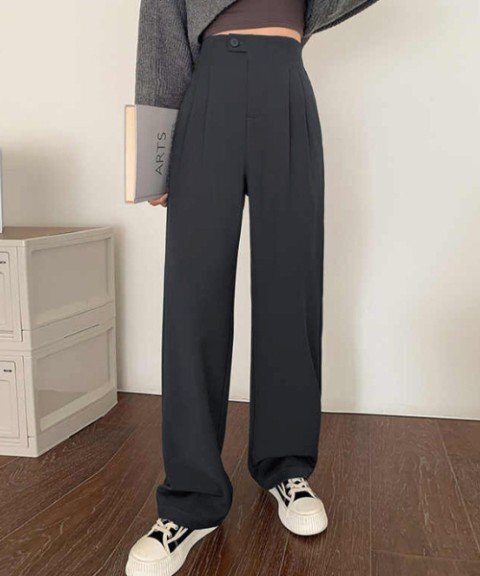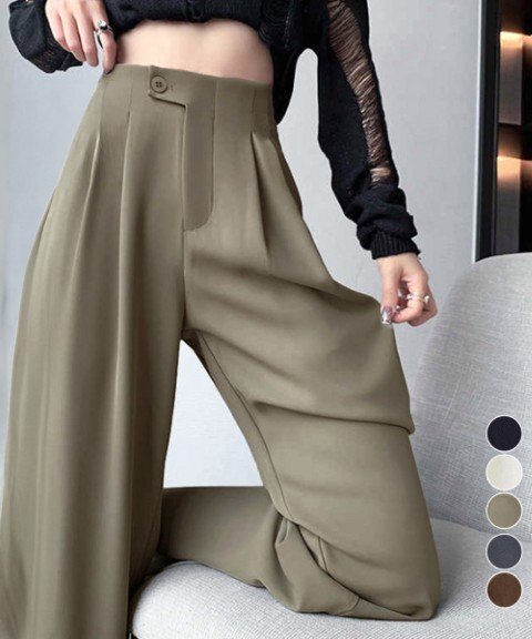 ウエストボタンのディテールが目を引く、立体的なシルエットが美しいハイウエストのタック入りスラックスパンツ。