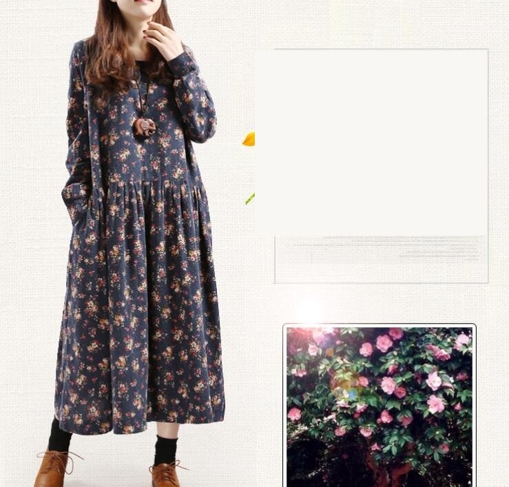 大人気新品 紺色地に小花柄がおしゃれなロング丈ワンピ 大きいサイズ ナチュラル系 長袖コットンワンピ