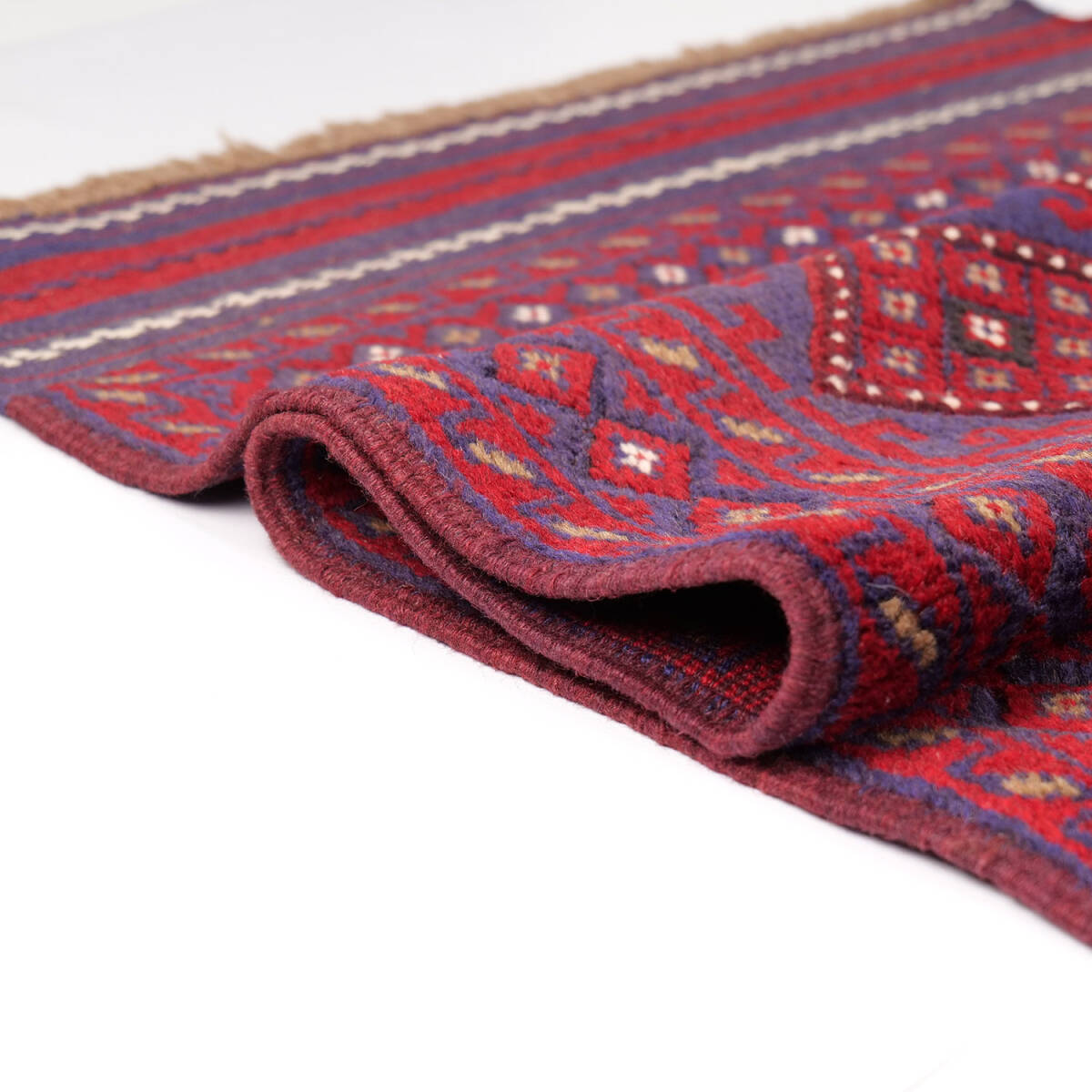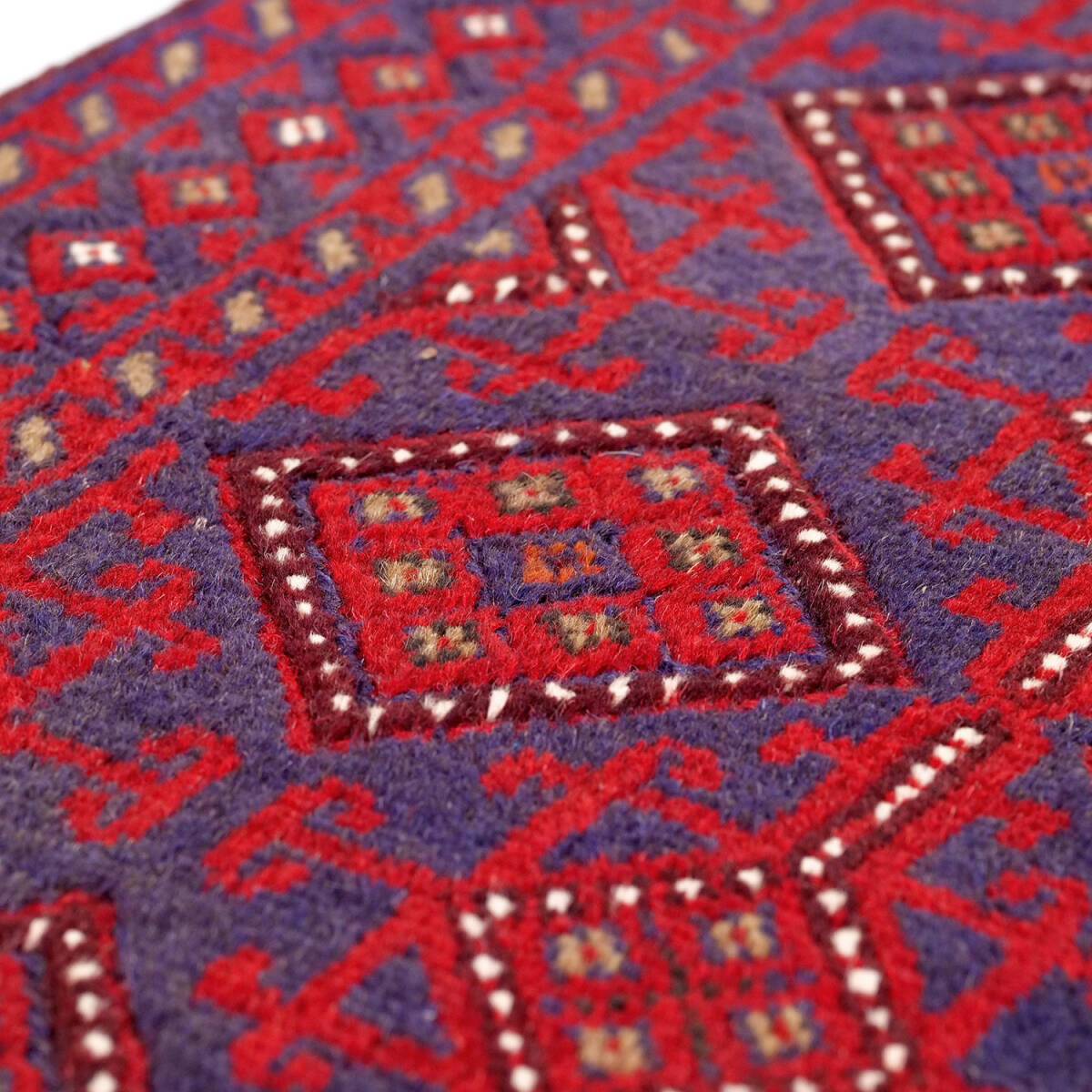 1960年代に制作されたアフガニスタン産のセミアンティークラグです。フィールド全体にダイヤモンドモチーフが連続し、赤を主体とした深みのある色合いに黒と生成りのコントラストが加わり、引き締まった印象を与えています。サイズは3700×710mmで、ケナーレ(Kenare)と呼ばれるサイズで、廊下やベッドサイド、通路など細長い空間に最適です。