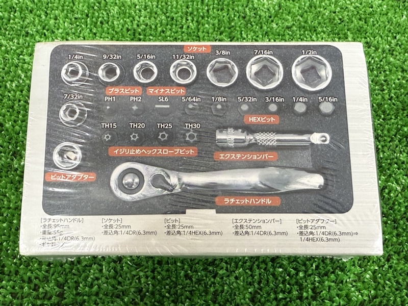【セット内容】 ・ラチェットハンドル ・ソケット:7/32、1/4、9/32、5/16、11/32、3/8、7/16、1/2in ・プラスビット:PH1、2 ・マイナスビット:SL6 ・HEXビット:5/64、1/8、5/32、3/16、1/4、5/16in ・イジリ止めヘックスローブビット:TH15、TH20、TH25、TH30 ・エクステンションバー50mm ・ビットアダプター [ラチェットハンドル] ・全長:95mm ・重量:55g ・差込角:1/4DR(6.3mm) ・ギヤ数:72T [ソケット] ・全長:25mm ・差込角:1/4DR(6.3mm) [ビット] ・全長:25mm ・差込角:1/4HEX(6.3mm) [エクステンションバー] ・全長:50mm ・差込角:1/4DR(6.3mm) [ビットアダプター] ・全長:25mm ・差込角:1/4DR(6.3mm)→1/4HEX(6.3mm) 未使用品ではございますが、保管中のキズ・汚れ等はご容赦下さい。 画像の物が全てになります。 他に付属品等はございません。 上記の事をご理解・ご了承の上で ご入札をお願い致します。 その他 ご不明な点等ございましたら ご入札前に お気軽に ご質問下さい。 オークション終了日 当日は 午後5時迄に ご質問は お願い致します。 夕方以降に ご質問等 お問い合わせ頂きましても お応えするのが 翌営業時間中になりますので ご了承ください。 *詳細につきまして ご質問されましても お答えできない場合もございます。 | ||||