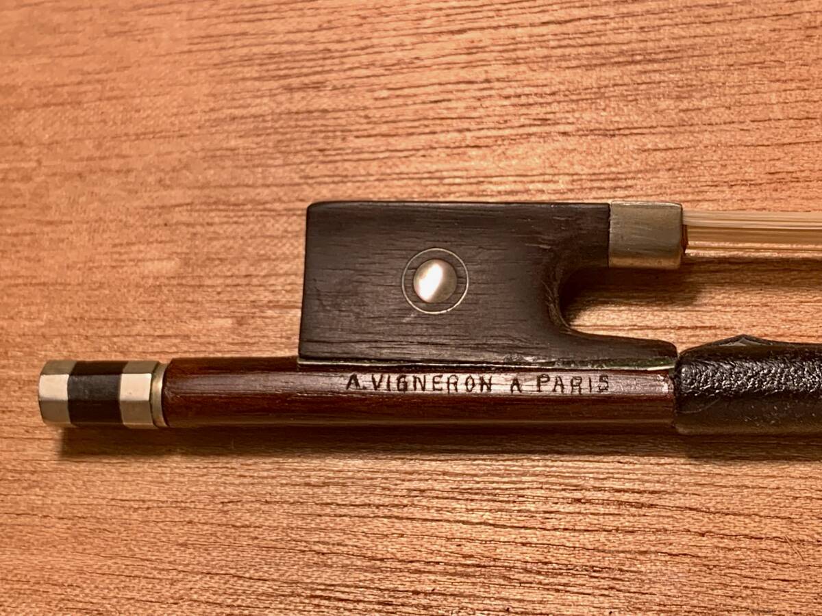 1.スティック:丸弓 2. A.VIGNERON A PARIS    と刻印されています。。 3.材質:フェルナンブーコ 4.チップ:ボーン .5:新品 バイオリンの髪 6.フロッグ:黒檀 7.クラックはありません。 8.弓はまっすぐで、曲りはありません。 9.全長:  74,2 cm. / 57,2 g. /  balance point 26  cm. !!!!