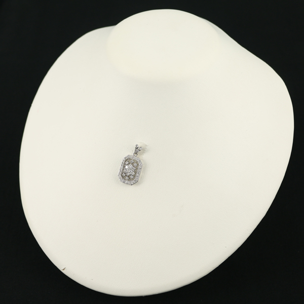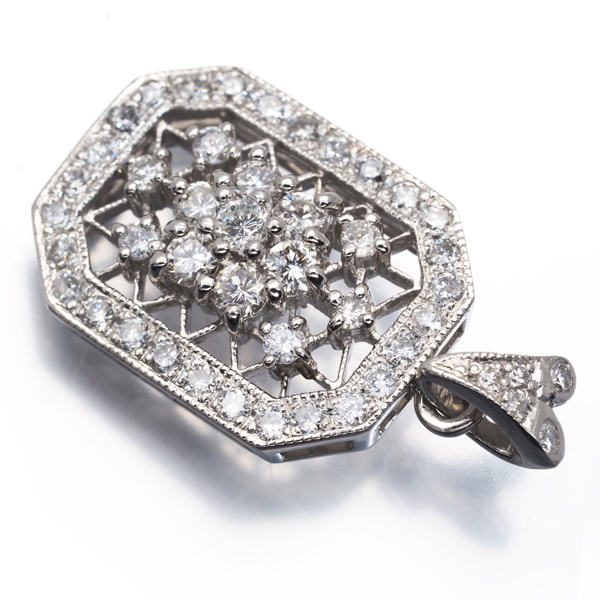 繊細なミルグレイン細工と共に透かしを演出したクラシカルな雰囲気漂うわすダイヤモンドジュエリー。セレクトされたダイヤは多少の内包物が見られる石もございますが、瑞々しい透明感と眩いテリを披露。美しいデザインと総計1.00ctものダイヤモンド達が胸元にエレガンスを与えてくれるでしょうね。 |