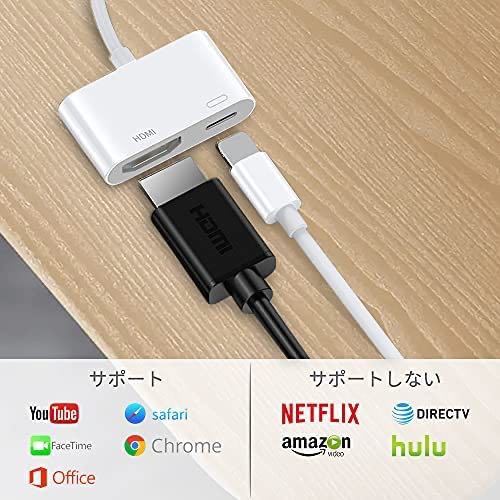 3. ディスプレイなどにHDMIケーブル(別売り)を接続して、ライトニング充電ケーブルでライトニング Digital AVアダプタと電源をつなぎデバイスのライトニングコネクタにライトニング Digital AVアダプタを接続するだけでミラーリングできる。一部有料APP(amazonTV等)には対応しません、例えばNetflix、u-next、dtv、Amazonプライムビデオ、Directv、hulu、NBAアプリなどに対応しません。(YouTubeには対応しております)・ライトニングケーブルは5V1Aに対応した物をお使い下さい。(純正の充電器であれば問題ありません)
