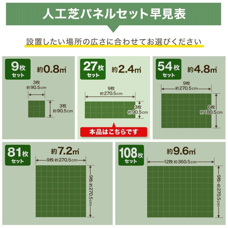 素足で歩きたくなるやわらかさ。 本物の天然芝と見間違えるほどのリアル感! パネルタイプの人工芝です。 ジョイント式で簡単設置! 人工芝なので枯れる心配も無ければ、メンテナンスもほぼ不要。 年間を通してきれいな緑が素晴らしい景観を保ちます。 水抜き穴が空いているので水が溜まる心配はありません。 屋外用の照明やイルミネーションなどの配線を裏面の隙間に通すことも可能です。 のこぎりや園芸用の大型ハサミでカットできるので自由に配置も可能です。 ジョイント式タイプのものと組み合わせ自由♪ 大切なお庭のアレンジにぜひお役立てください♪ ■商品コード:ACE005SA ■商品仕様 27枚セット 人工芝部分(約):幅29.5cm×長さ29.5cm×高さ3cm ジョイント部分含む(約):幅30.5cm×長さ30.5cm×高さ4cm 重量:1枚あたり(約)0.35kg ■注意事項 ・海外製品のため多少の傷、汚れがある場合がございますがご了承ください。 ・商品は、モニターによって色合いが異なって見える場合があります。 ・仕様・デザインは改良のため予告なく変更することがあります。 ■保障期間 7日間 ※商品到着後7日以内の初期不良・破損のみご対応させていただきます。 【新品未使用品です】 |