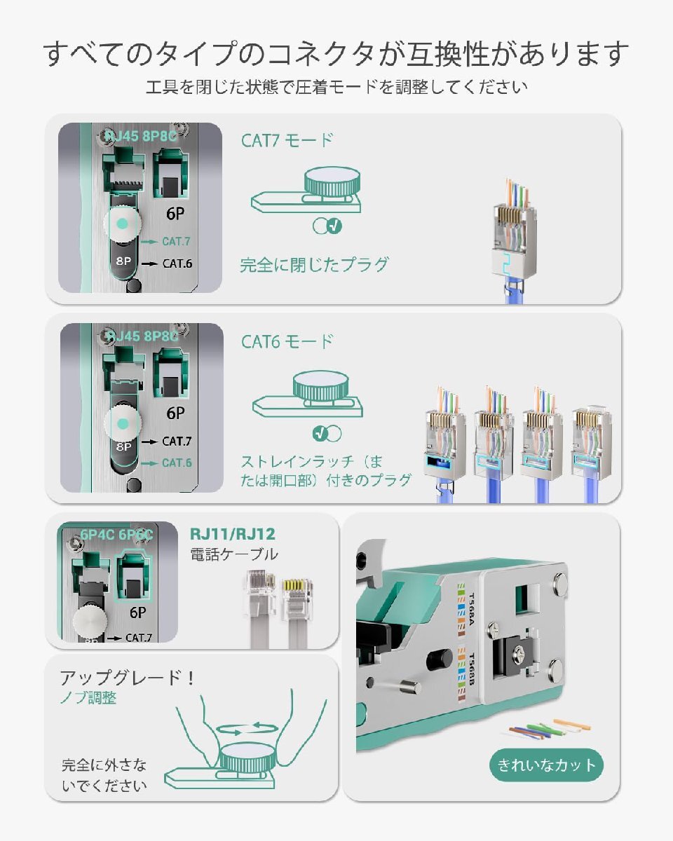 【各種のコネクタに対応】RJ45、RJ12、RJ11の金属製、プラスチック製、貫通型、非貫通型など、様々なコネクタータイプに対応します。手動で調整できるノブを使って、クリンパープレートを簡単に調整し、毎回完璧なクリンプを実現できます