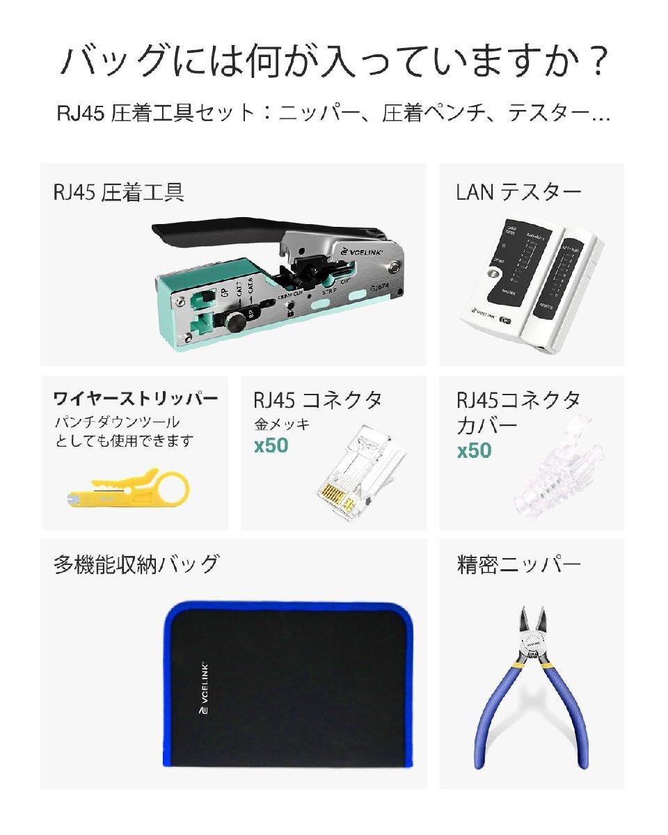 ブランド:VCELINKカラー:クロム【LANケーブル自作工具キット】LAN圧着工具セットには布袋、カシメ工具、LANテスター、ミニストリッパー、精密ニッパー、50個のLANコネクタ、50個の保護カバーを含む、効率的なインストールと収納に最適なセットです