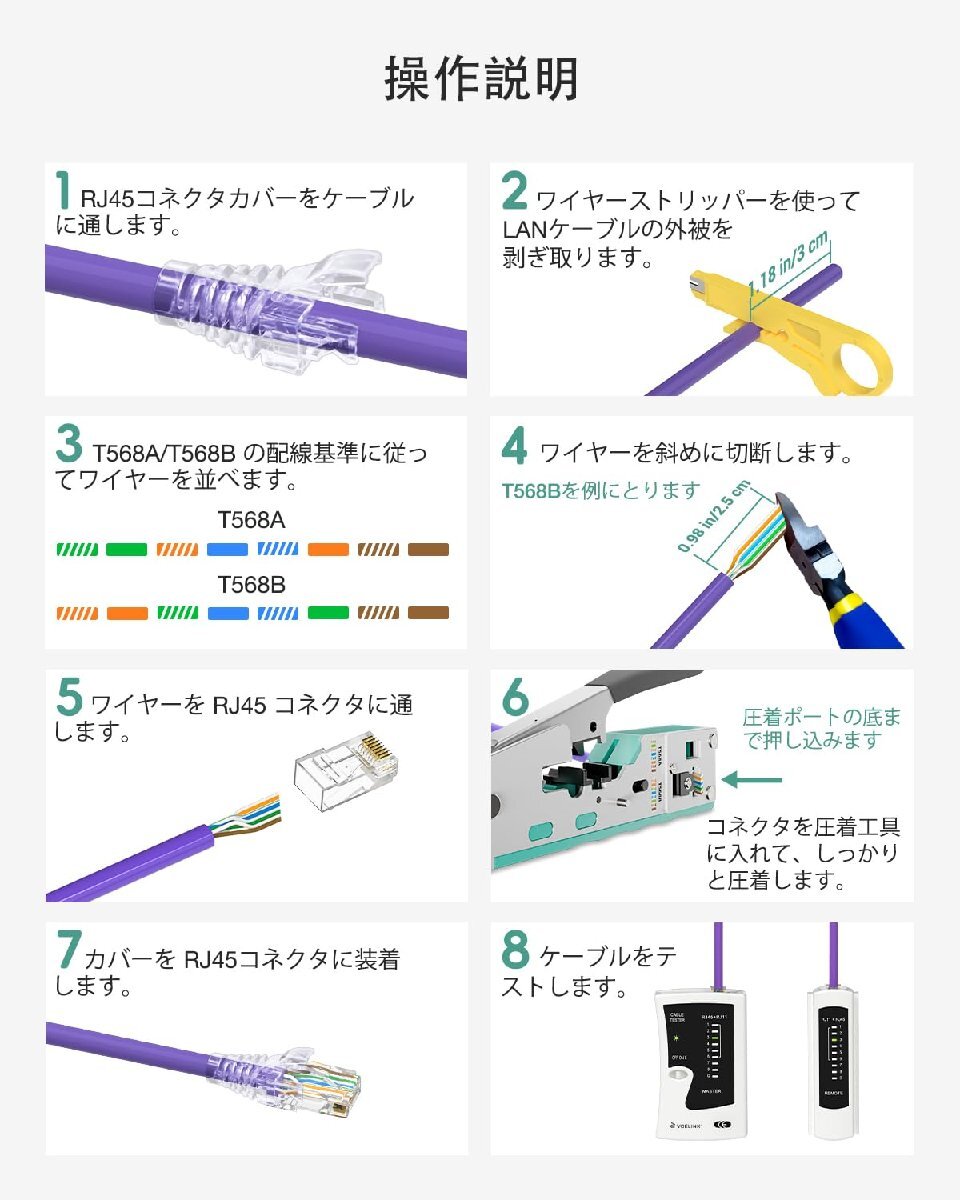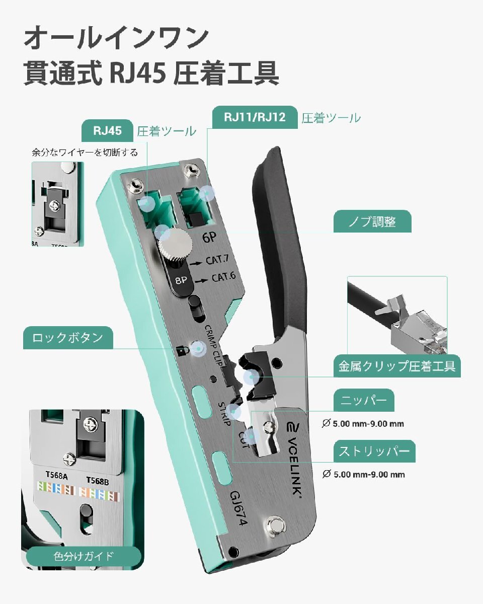 【多機能LANケーブル工具】穴あきのような貫通型RJ45コネクタを圧着中、余分なワイヤーを綺麗に切断できるかしめ工具です。鋭くて耐久性のあるSK5ブレードで、切断やストリッピングも簡単にできます。ツールには配線図があり、作業がより簡単になります