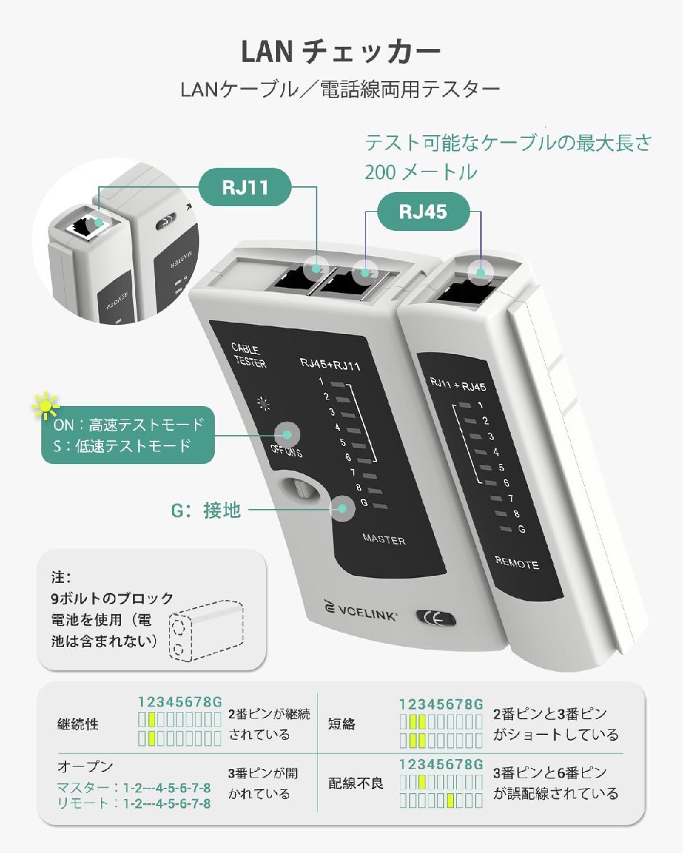【信頼性の高いLANケーブルテスター】短絡や誤配線を素早くチェックできます。インジケーターライト(No.1No.8)で確認でき、STP/UTPRJ45/RJ11/RJ12のコネクタに対応し、ケーブルが正しく配線されているか確認できます(9V電池は別売りです)