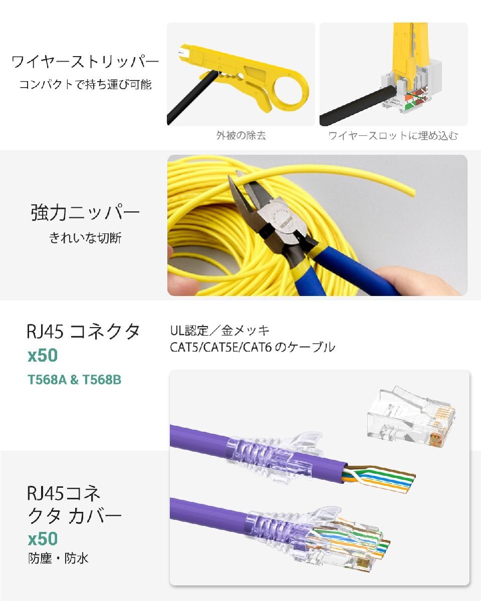 【アクセサリー完備】50個の金メッキ貫通式RJ45コネクタ、50個の保護カバー、ワイヤーカッター、ミニストリッパーが付属します。すべてが収納可能な布袋に入っており、DIYやネットワーク作業に便利で、手間もコストも節約できます