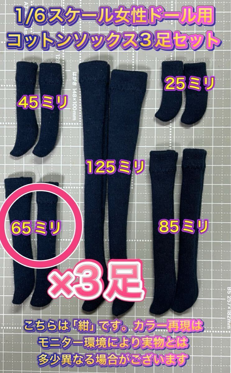 リカちゃん、ジェニー、ネオブライス、アイシードール 、オビツ27女性ボディ、ハッシュタグボディなどが着用出来る、ごくシンプルな綿のソックス長さ違い、平置きで約65ミリの3足セットです。