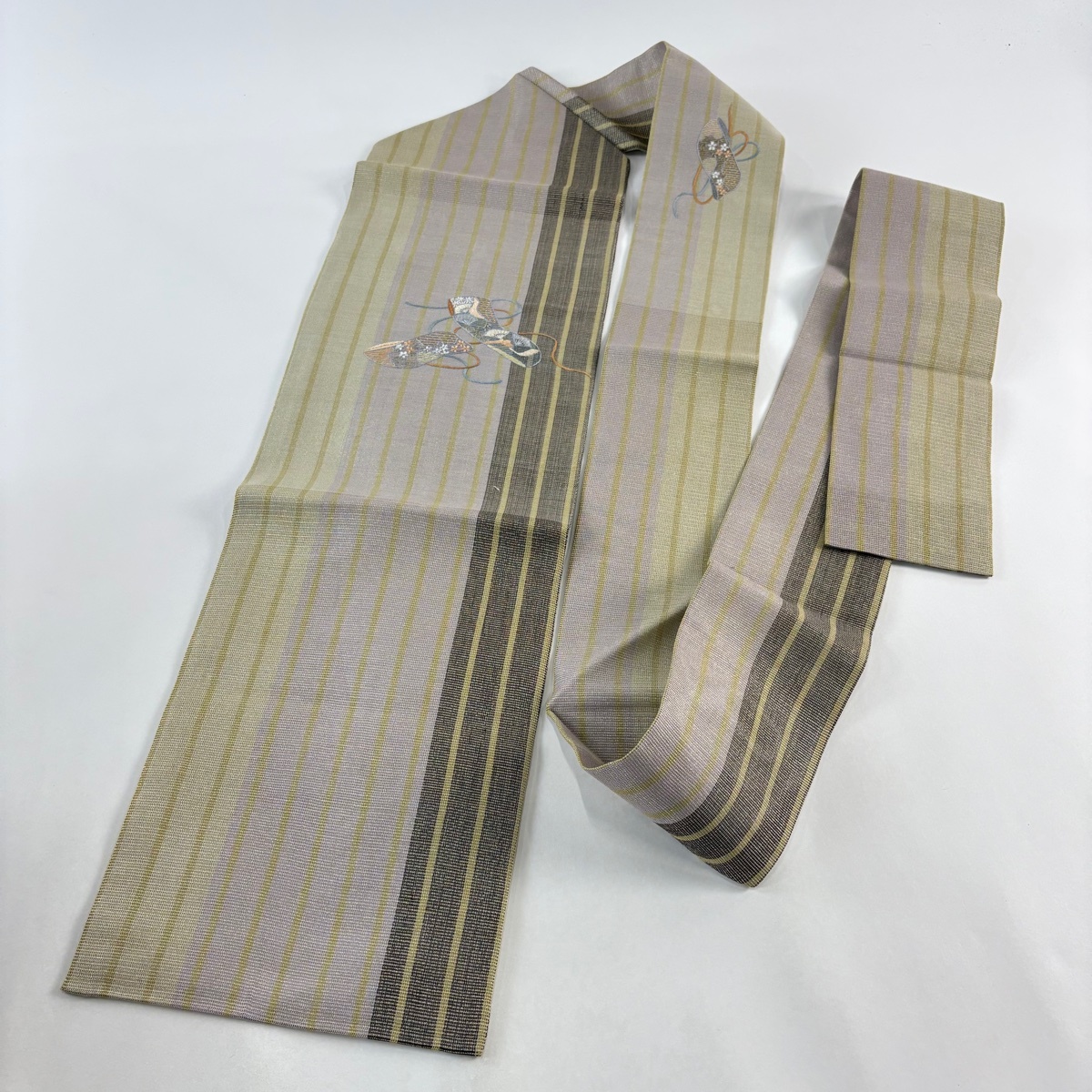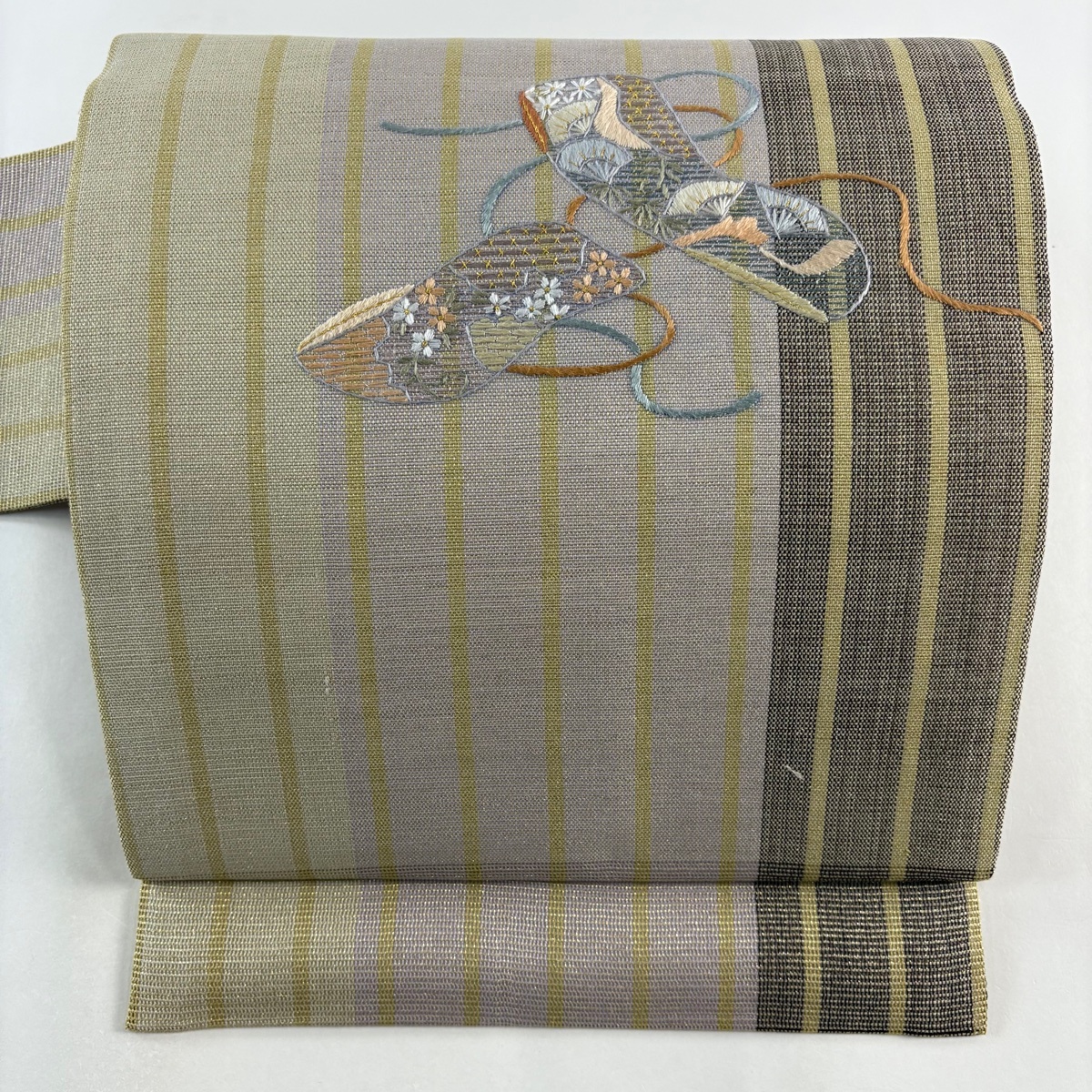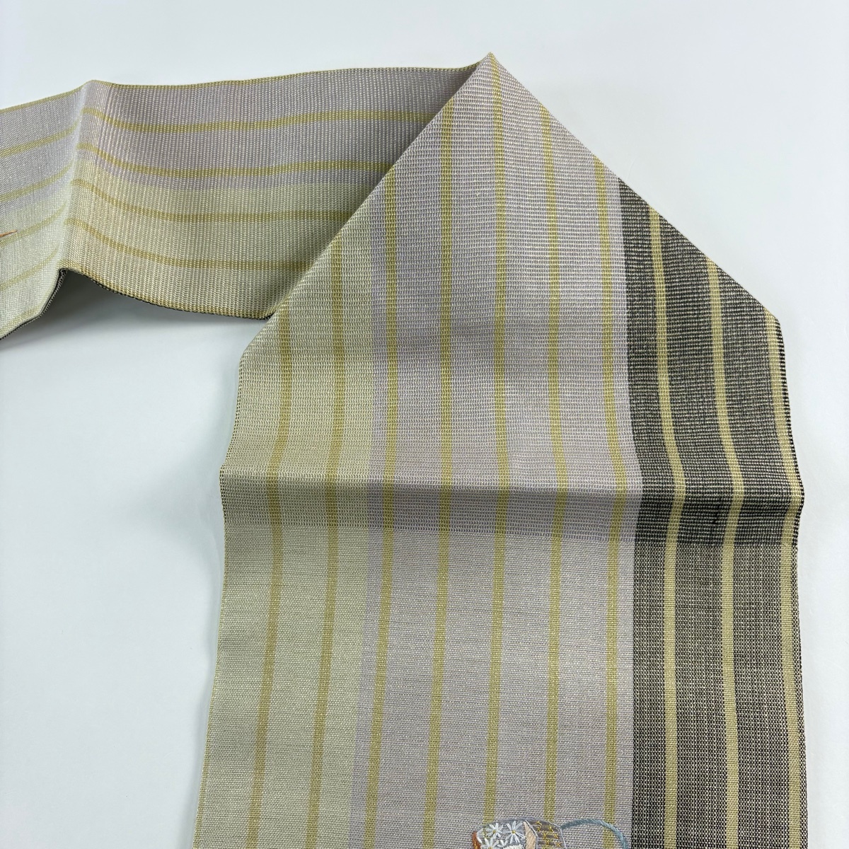 | 名古屋帯 美品 秀品 誰が袖 縞 刺繍 金通し 灰紫 正絹 【中古】 |