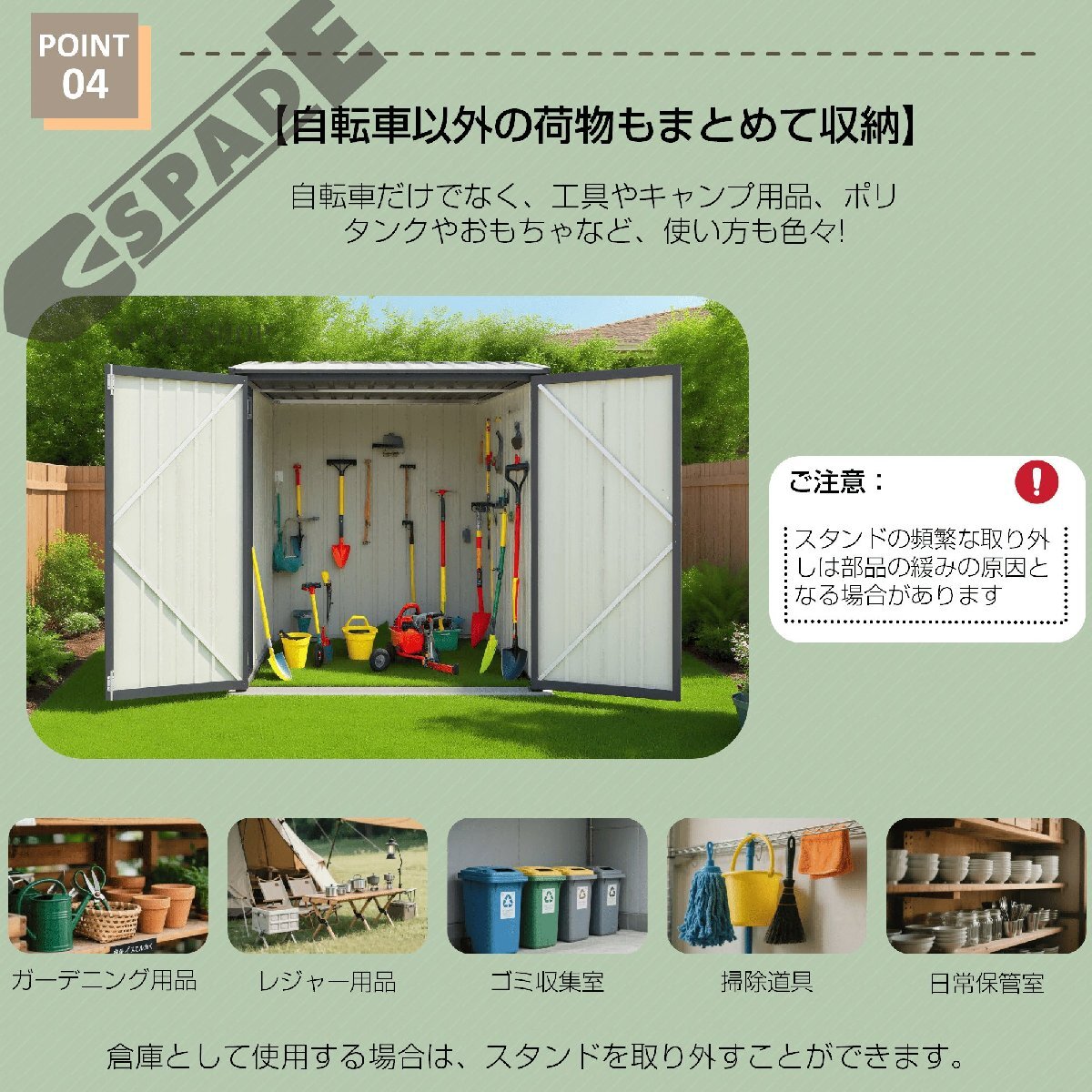 • 【自転車以外の荷物もまとめて収納 】自転車だけでなく、工具やキャンプ用品、ポリタンクやおもちゃなど、使い方も色々!ガーデニング用品 レジャー用品 ゴミ収集室 日常保管室 掃除道具倉庫として使用する場合は、スタンドを取り外すことができます。ご注意: スタンドの頻繁な取り外しは部品の緩みの原因となる場合があります