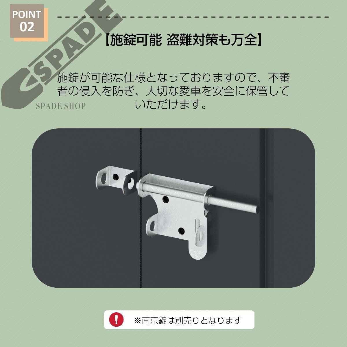 • 【施錠可能 盗難対策も万全 】施錠が可能な仕様となっておりますので、不審者の侵入を防ぎ、大切な愛車を安全に保管していただけます。※南京錠は別売りとなります