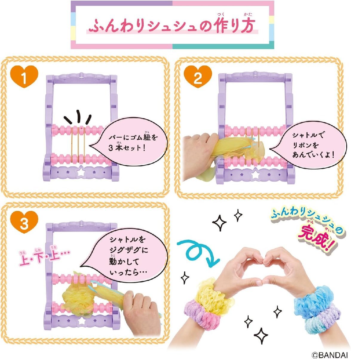 本体×1個、バー×2本、シャトル×1本、コーム×1個、ボンボン用パーツ×1個、仕上げ針/とじ針×各1本、オーガンジーリボン(リボンバック用)2色×各1束、オーガンジーリボン(ふんわりシュシュ用)2色×各1束、ゴム紐4色×各3本、平ゴム3色×各8本、モールヤーン(ユニコーンバック用)×1束、毛糸×1束、モールヤーン(もふもふヘアゴム用)2色×各1束、EVAシール3色×各1枚、ループエンド×2個、取扱説明書×1枚