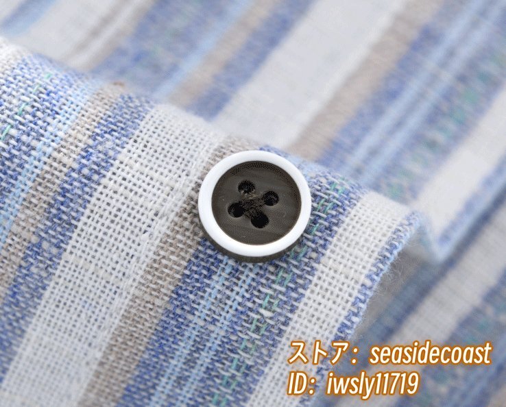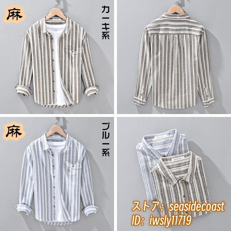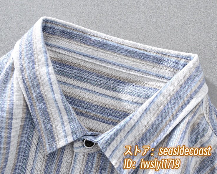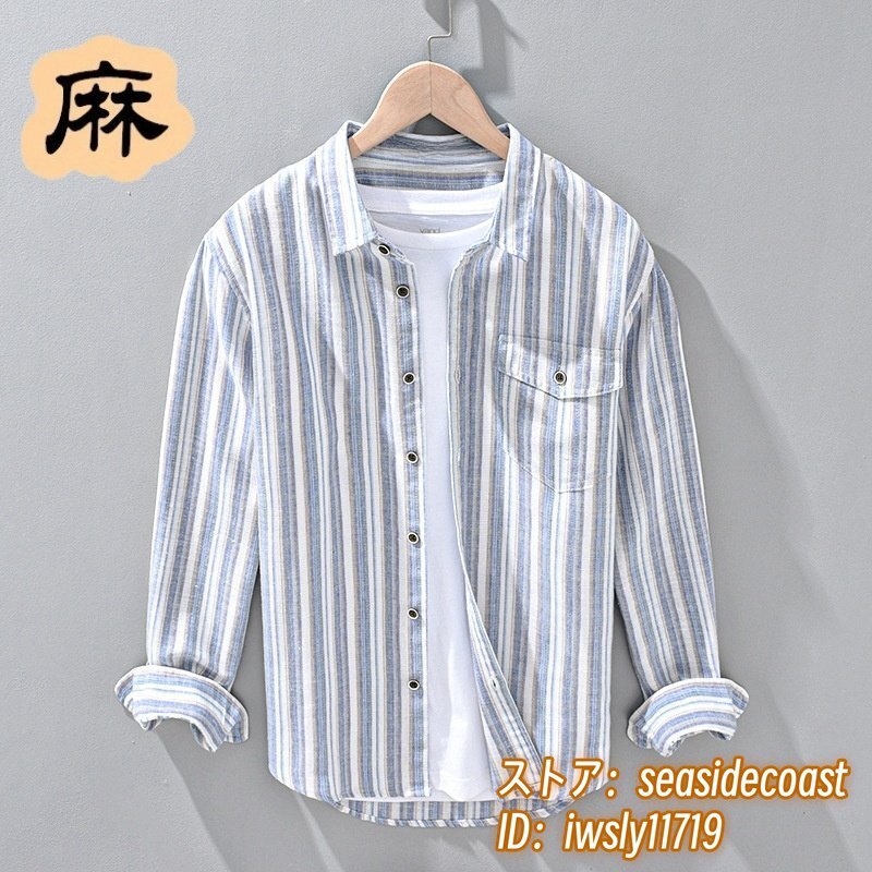特売新品 リネンシャツ 長袖シャツ メンズ 綿麻 ストライプ柄 アロハシャツ ヴィンテージ 清涼感 サマー 麻シャツ 心地良し ブルー系 M