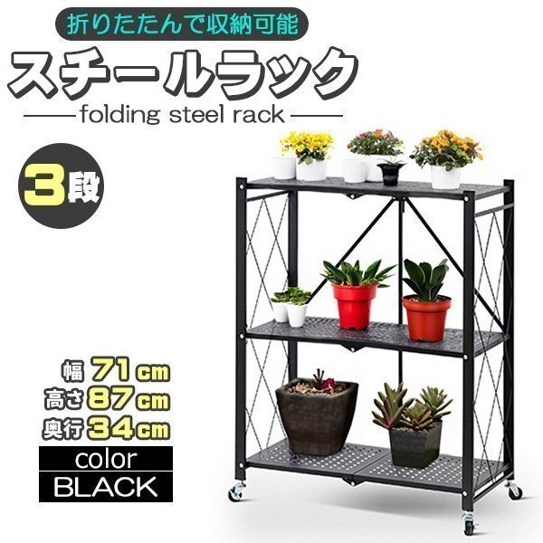 収納ラック 棚 金属シェルフ スチールラック メタルラック 折りたたみ 折り畳み スチール棚 キャスター付 組立簡単 頑丈 ブラック 黒 3段