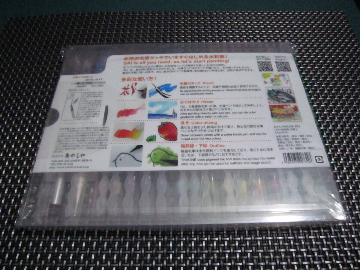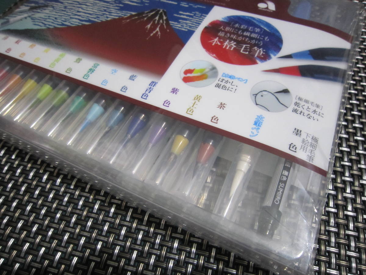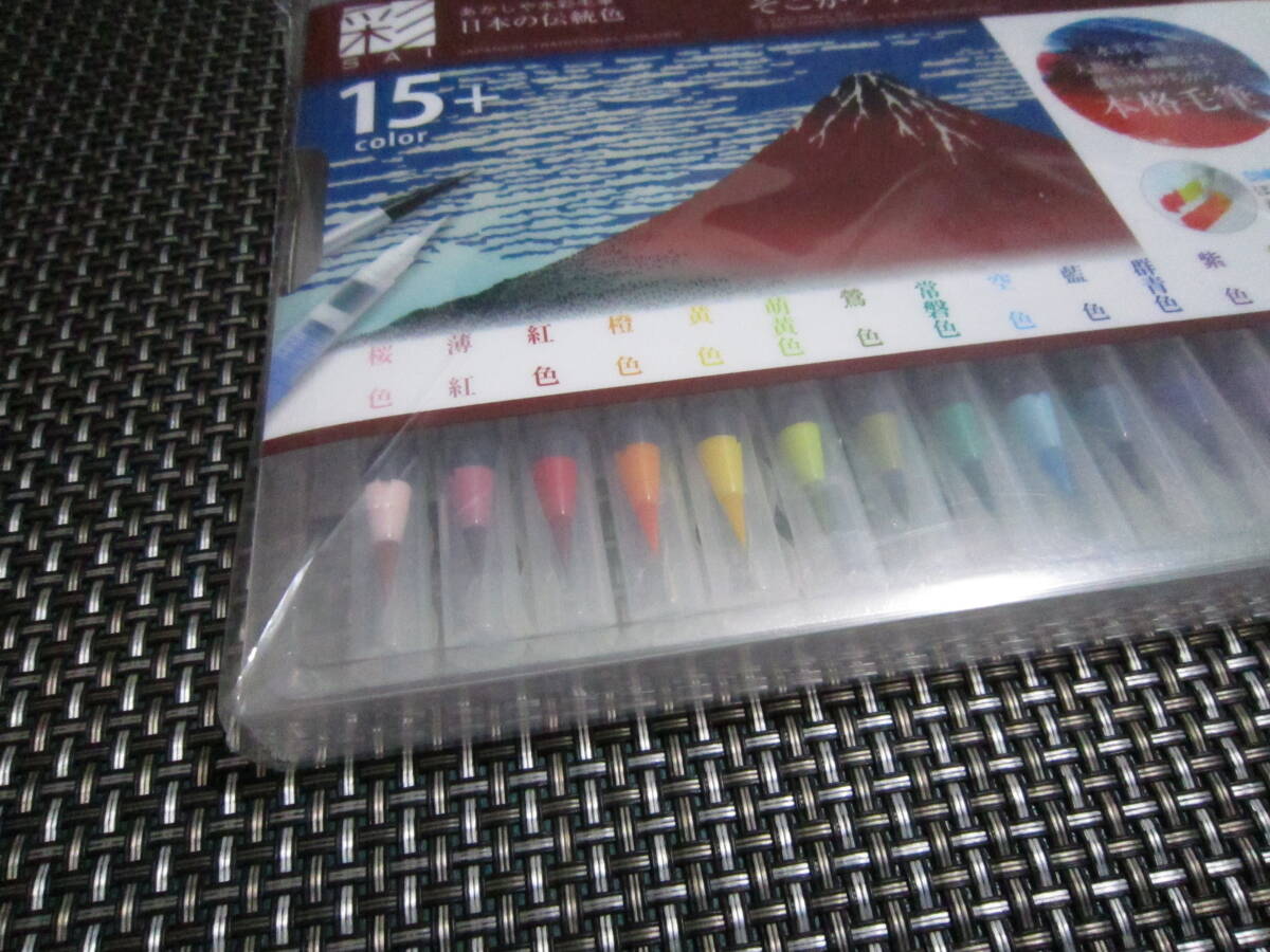 水彩毛筆 彩(桜色/薄紅/紅色/橙色/黄色/萌黄色/鶯色/常磐色/空色/藍色/群青色/紫色/黄土色/茶色)、水筆ペン 中、極細毛筆(墨色)