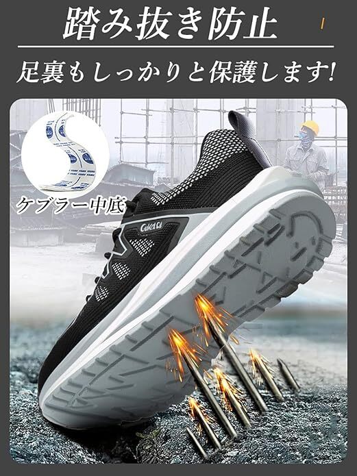 【安全第一】高強度鋼樹脂製先芯を内蔵し、万が一の重量物や落下物からつま先をしっかり守ります。さらに、ケブラーミッドソールを採用し、鋭利な金属片や不整地でも、安心して足元をサポートします。