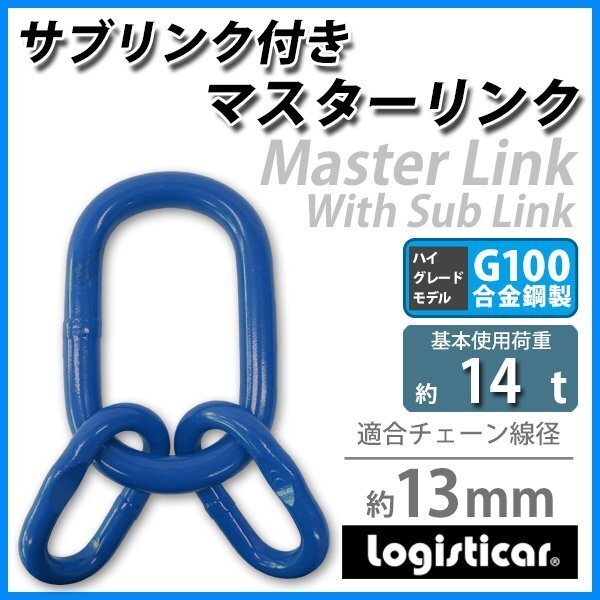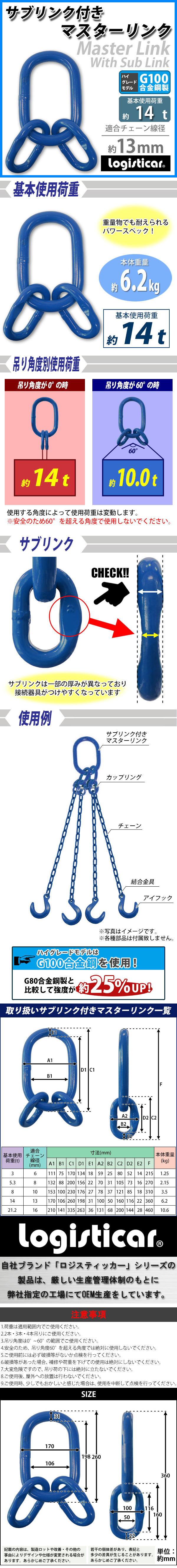 | 商品紹介 |                                                    ■◆サブリンク付き マスターリンク◆■                      ■使用用途に合わせて自由にカスタム出来るサブリンク付きマスターリンク! ■2本・3本・4本吊りにご使用ください。 ■吊り角度0°~60°まで対応! ■様々な場面で大活躍! ■G100合金鋼製で、G80合金製に比べて強度が25%増したハイグレードモデル! ■焼き入れを行うことで強度を増しています。 ■簡単接続。 ■シリーズでサイズを豊富にご用意しております。 ■重量:約6.2kg ■基本使用荷重:約14t(14000kg) ■適合チェーン線径:約13mm ■材質:G100合金鋼(本体) ■製法:鍛造 ■塗装:粉体塗装 ●新品商品ではありますが、輸入商品の為、多少の擦り傷などがある場合がございますので、ご納得の上ご購入下さいませ。 ●ご購入後、お客様ご都合によるご返品、ご返金等は一切お受け致しておりません。 ●本商品を使用した際に発生したトラブル、事故につきまして、当社は一切の責任を負いません。ご使用に関しましては、全て自己責任にてお願い致します。  |
