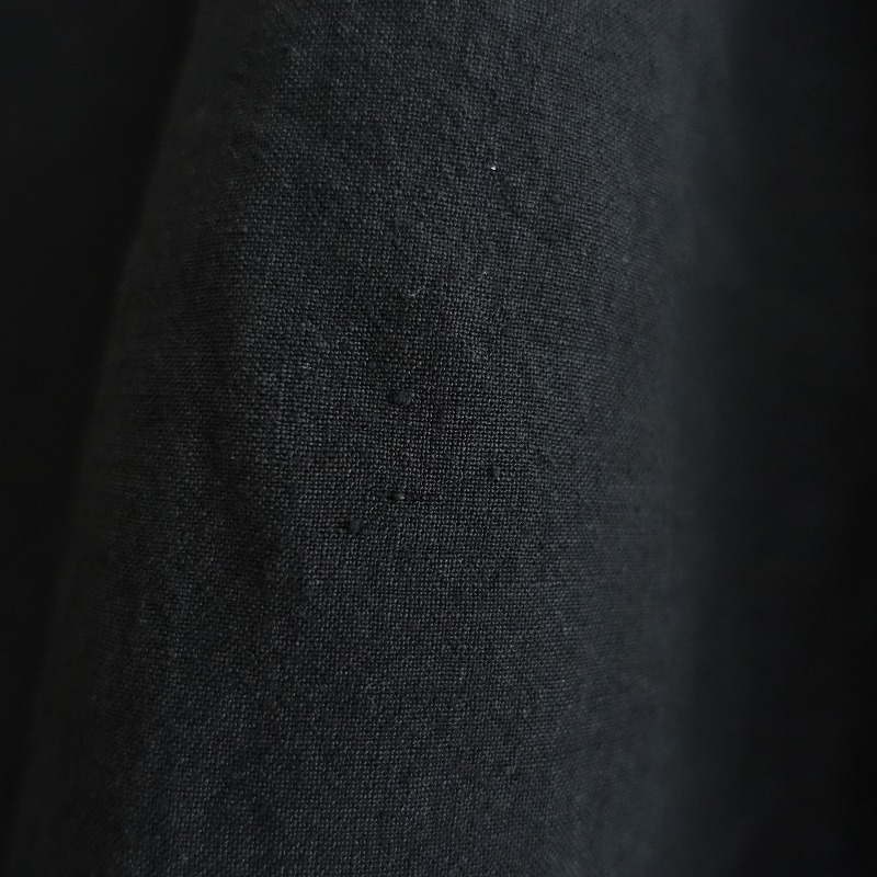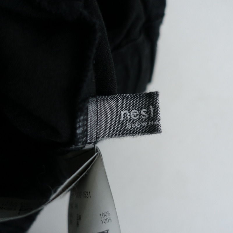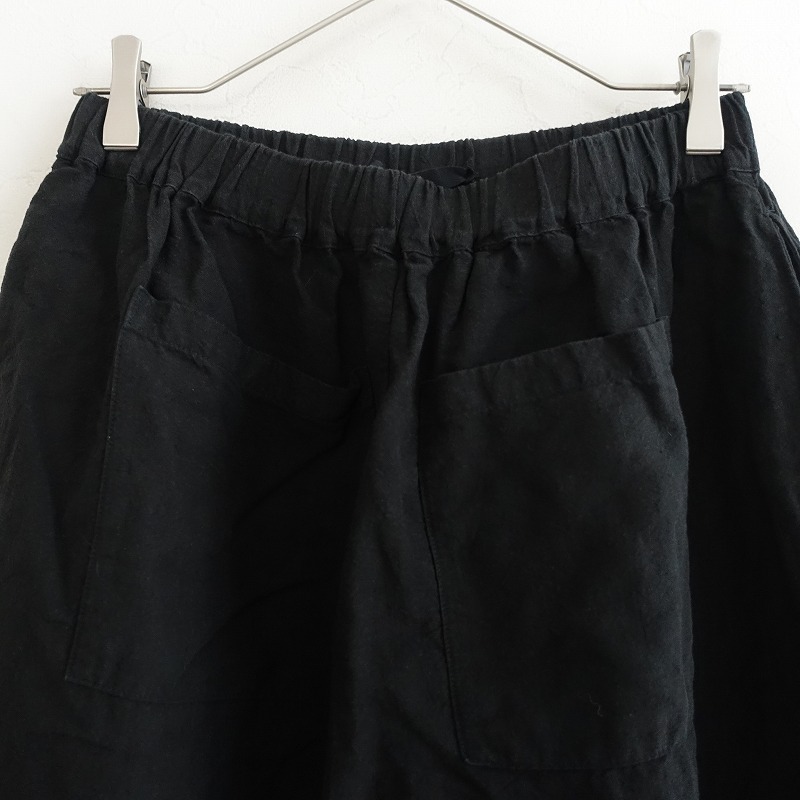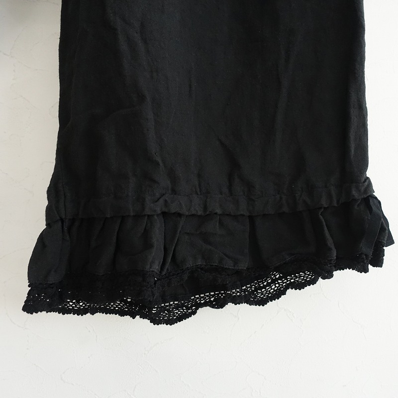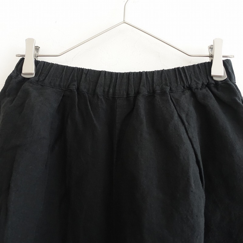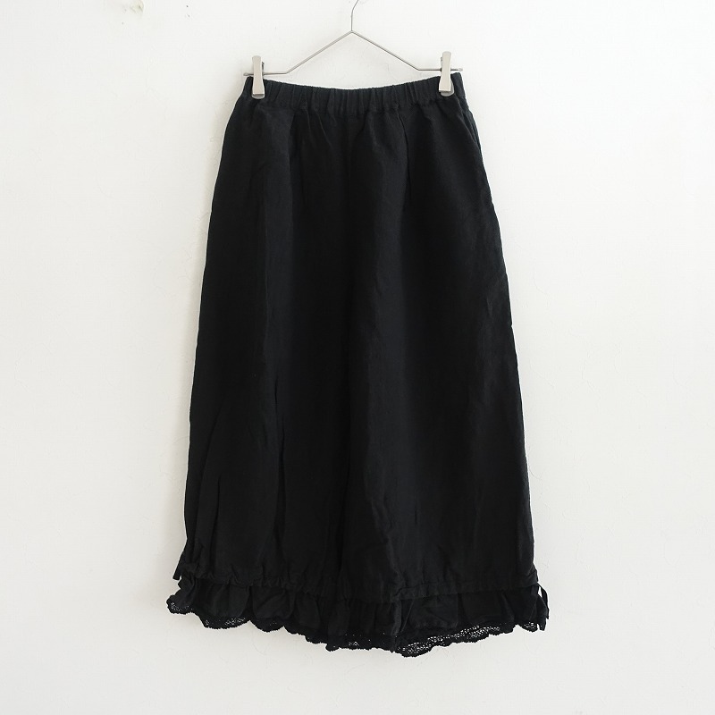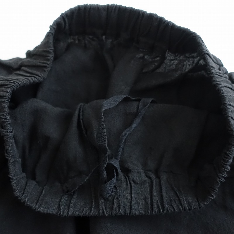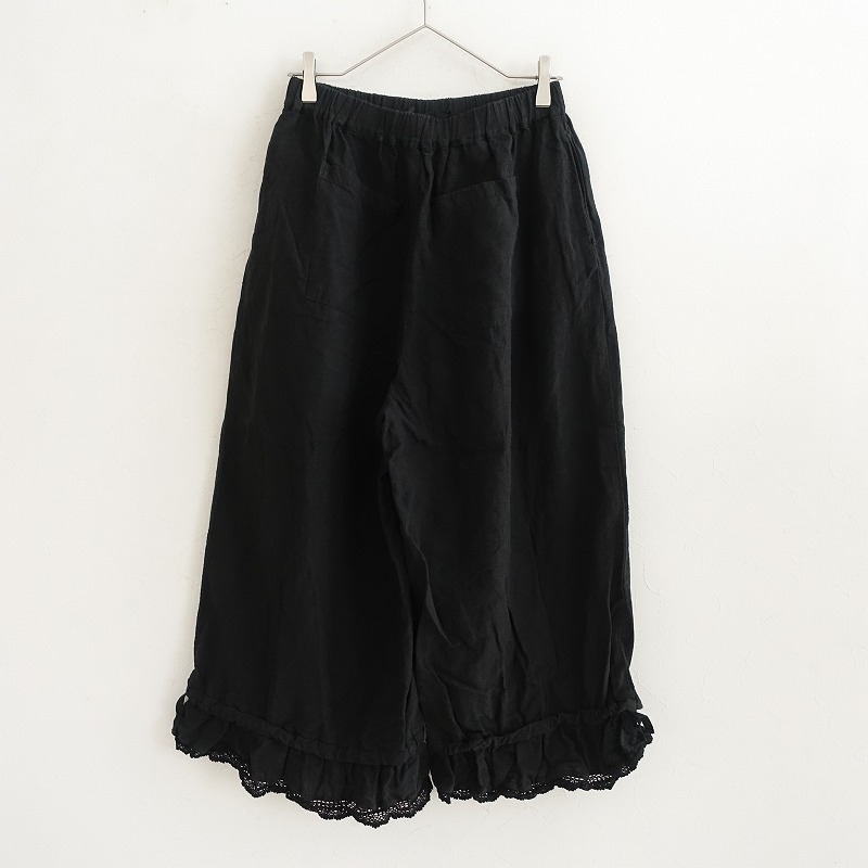 2024年コレクション nest Robeのリネン近江晒し裾レース2WAYパンツです。カラーはブラックです。サラリとした清涼感のあるリネンの晒し生地を使用。透け感はなく、麻特有の糸節・ネップ・染ムラなどが見受けられるナチュラルな素材です。ウエストはゴム&紐入りのイージー仕様。フロントにイン方向の1タック入りです。裾は2WAY仕様のドローストリングで、レースを配したラッフルフリルがあしらわれております。ヒップにパッチポケット、両サイドにシームポケットがございます。 |