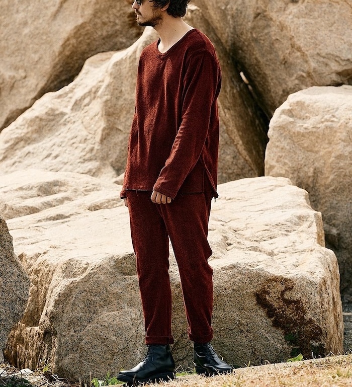 岡山の「井原」にて製作されたwjkオリジナルテキスタイルと組み合わせることで独特な雰囲気を加えている。