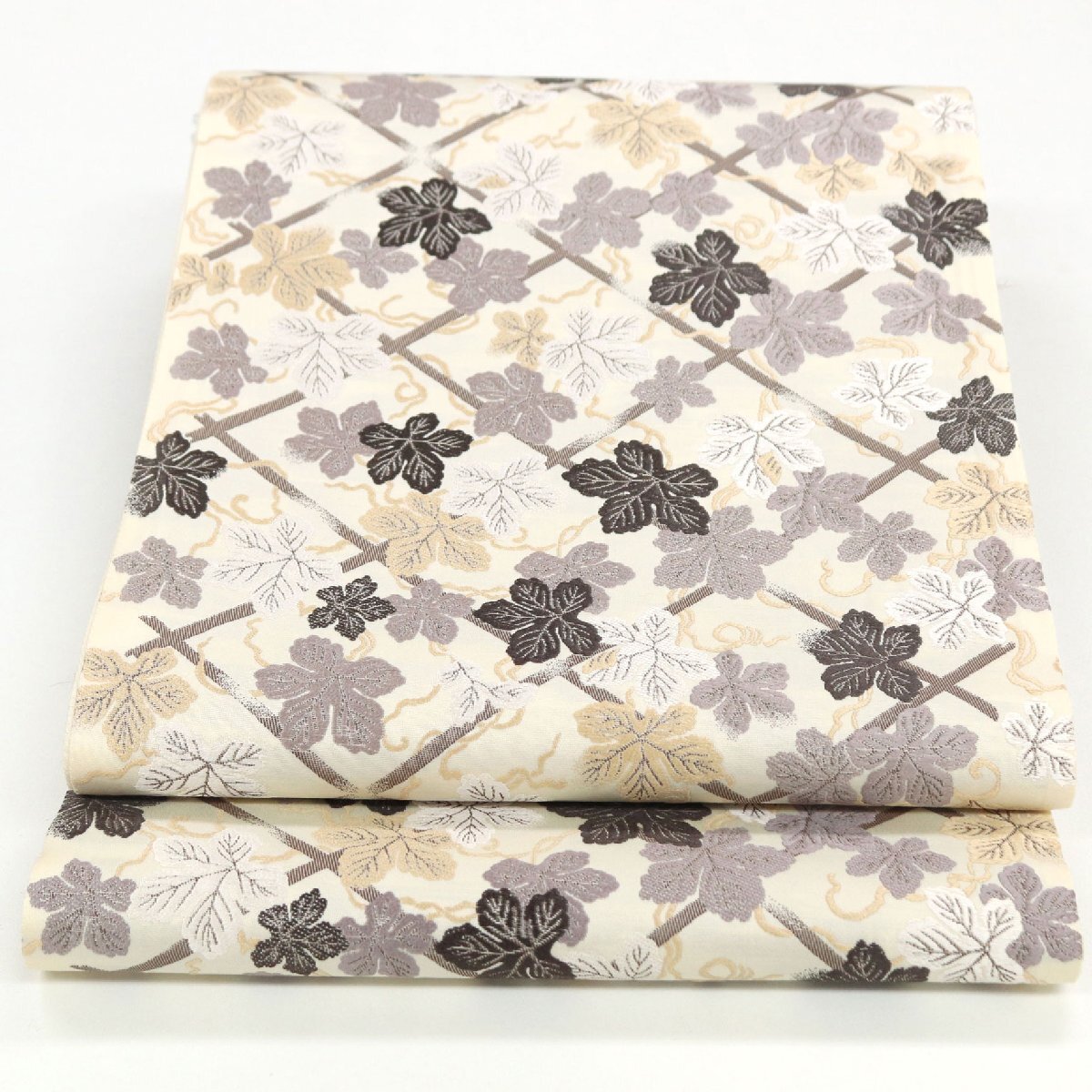 全体には黒檀色、白色、灰藤色、黒茶色、ベージュ色などのお色目で、菱格子に蔦模様がふっくらとした織で表現されております。