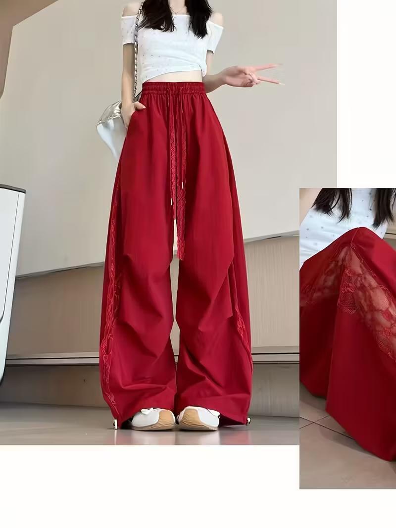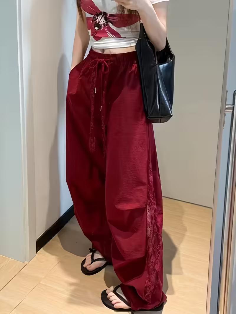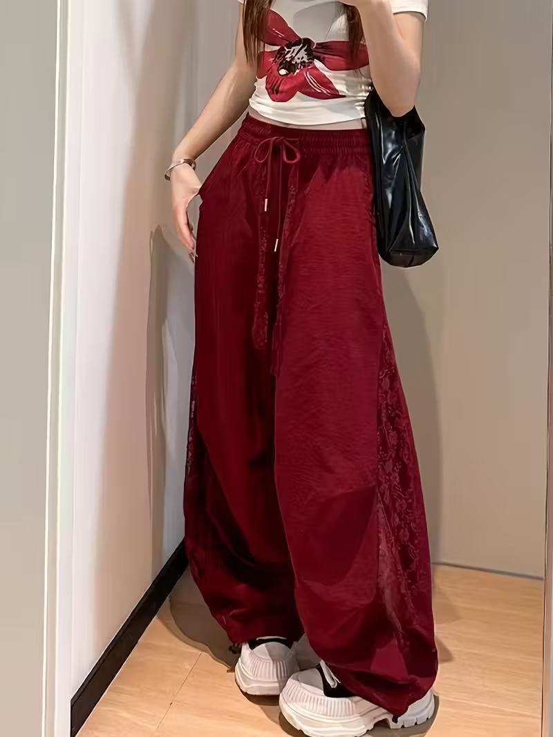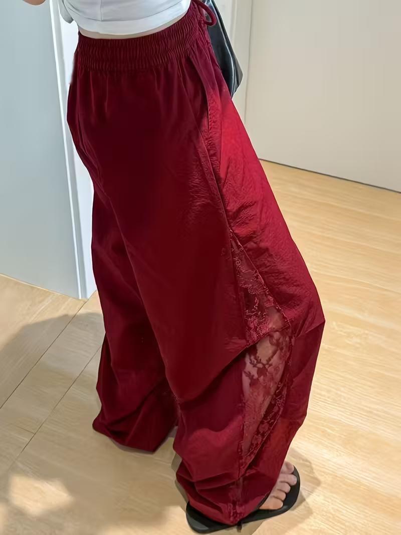 レースのパッチワークがポイントになった、大人可愛いワイドパンツ。