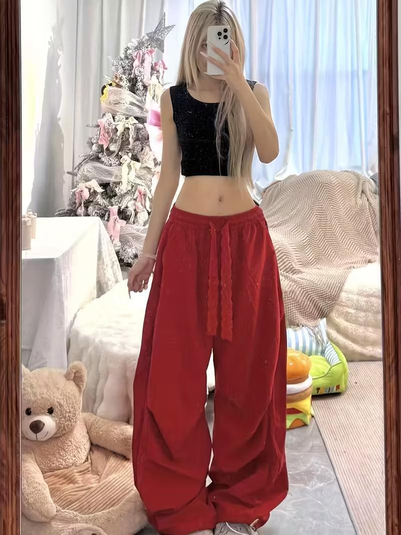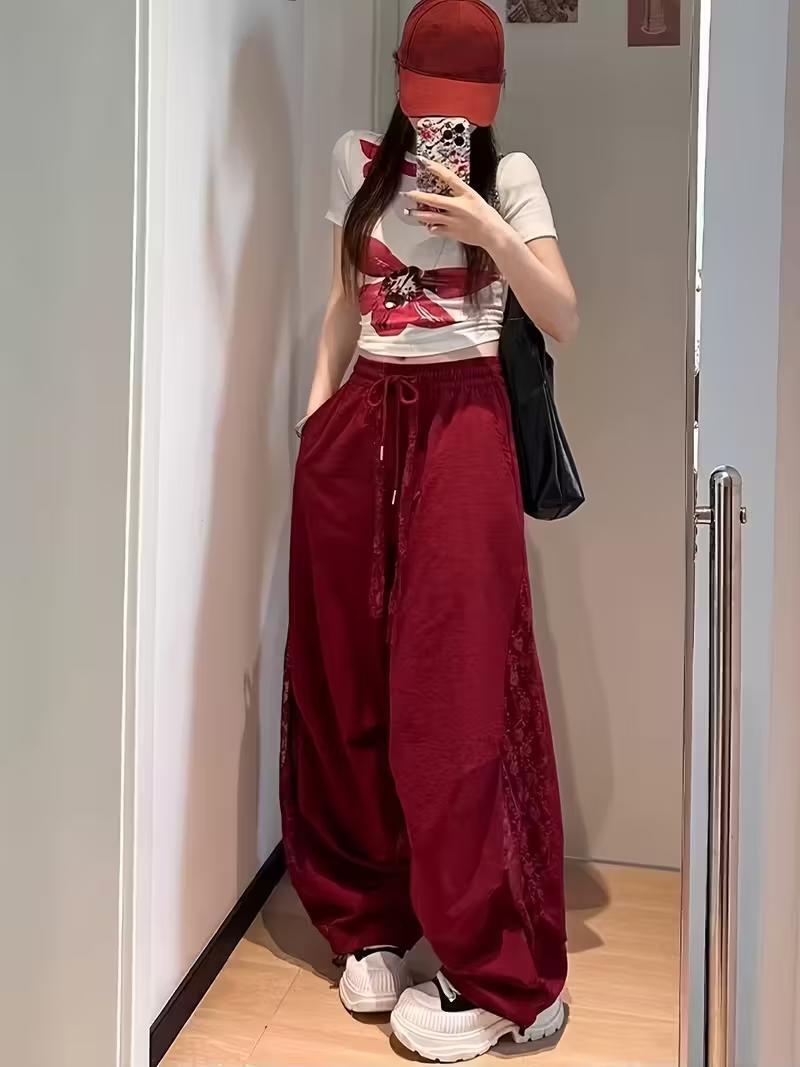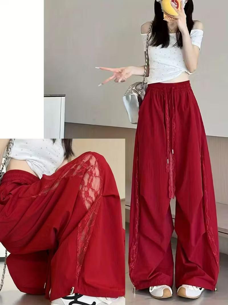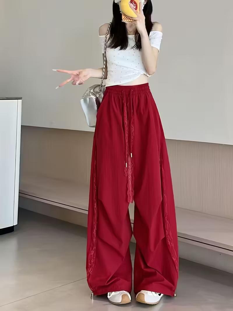 レースのパッチワークがポイントになった、大人可愛いワイドパンツ。