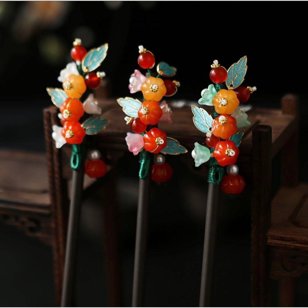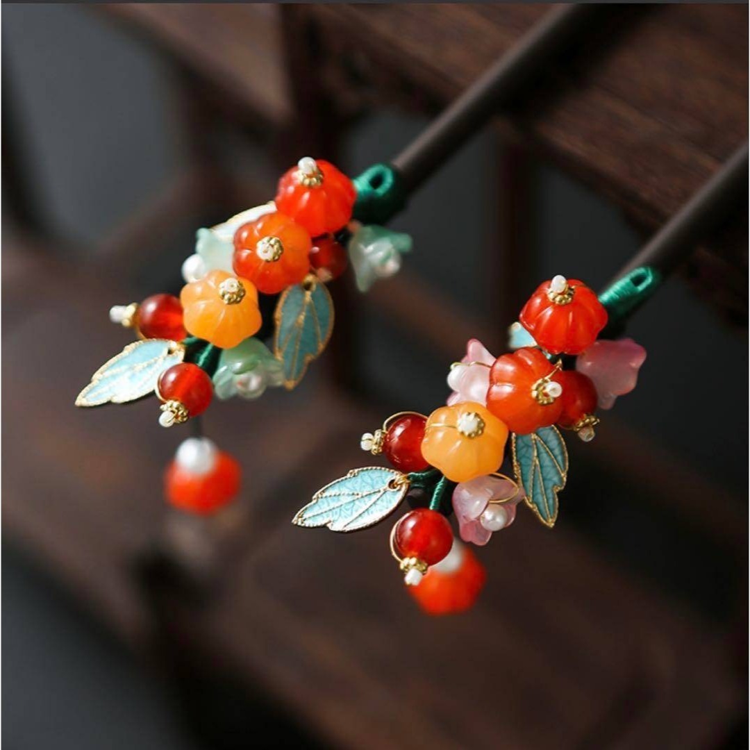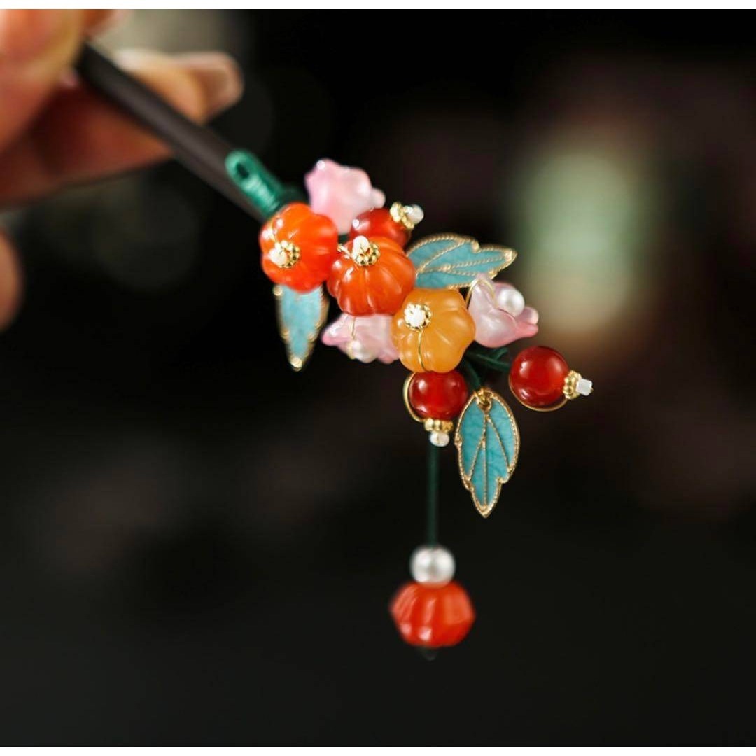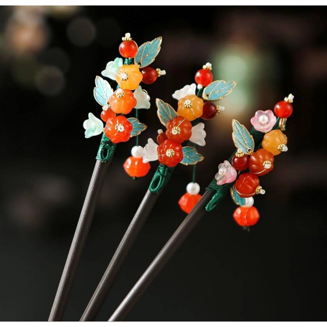 赤・オレンジ・ピンクのビーズで花を表現した、華やかなデザインの簪です。