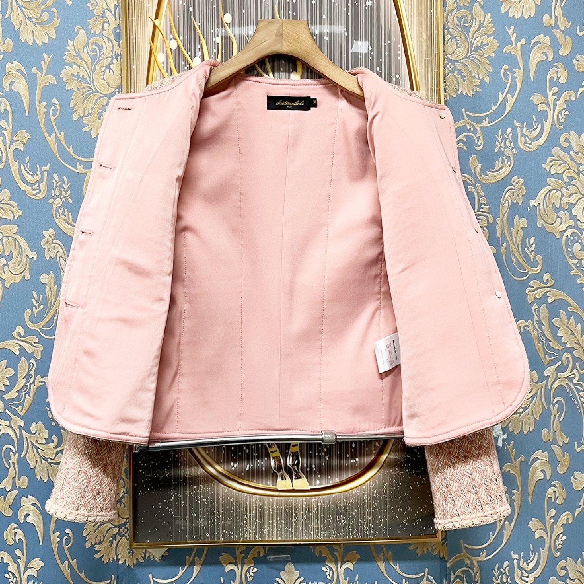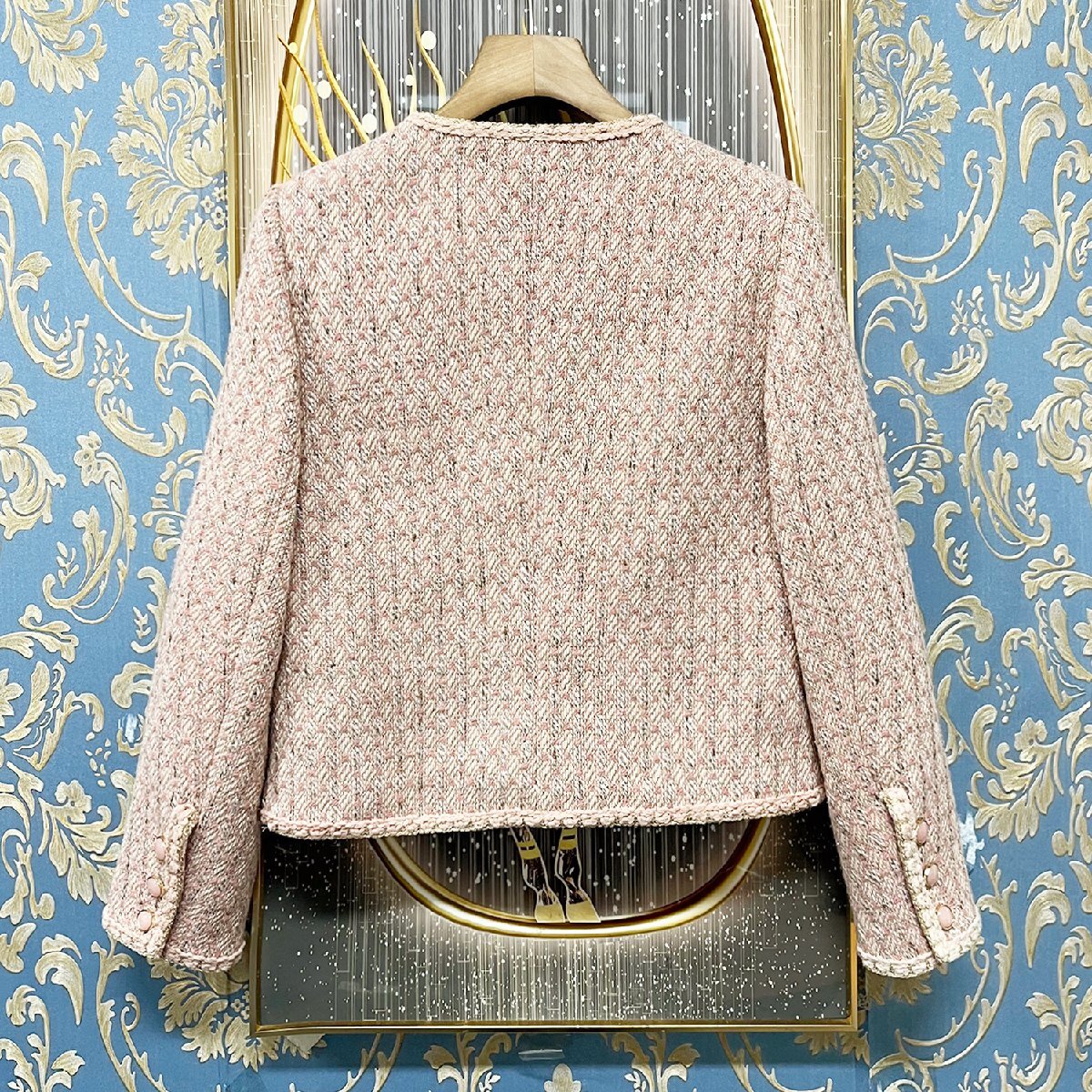 シルエットは女性らしいエレガントなラインを強調しており、カジュアルからフォーマルまで幅広いシーンで活躍する一着です。着丈が長すぎないショート丈なので、ボトムスを選ばすバランス良くコーディネートできます。