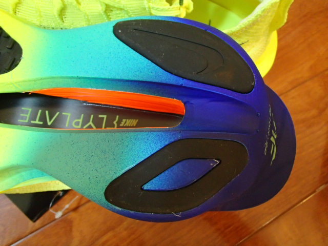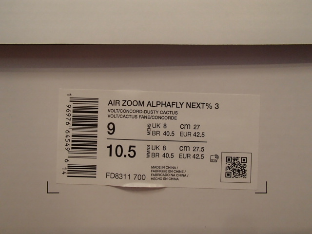 ナイキ アルファフライ3 US9.0 27.0cmです。状態は未使用品です。前作から軽量化され、ミッドソールが前後連結されエアポッドの配置もややミッドフット寄りになったように感じます。前足分形状やカーボンプレート幅の変更などのためか接地後の重心移動がとてもスムーズになった印象でした。アッパーは前作より脱ぎ履きしやすくなったにも関わらず全体的なフィット感、踵や足首のホールドも他ブランドよりは相変わらず優れている印象でした。コレクション整理で今後使用機会が無くなるためお譲りします。