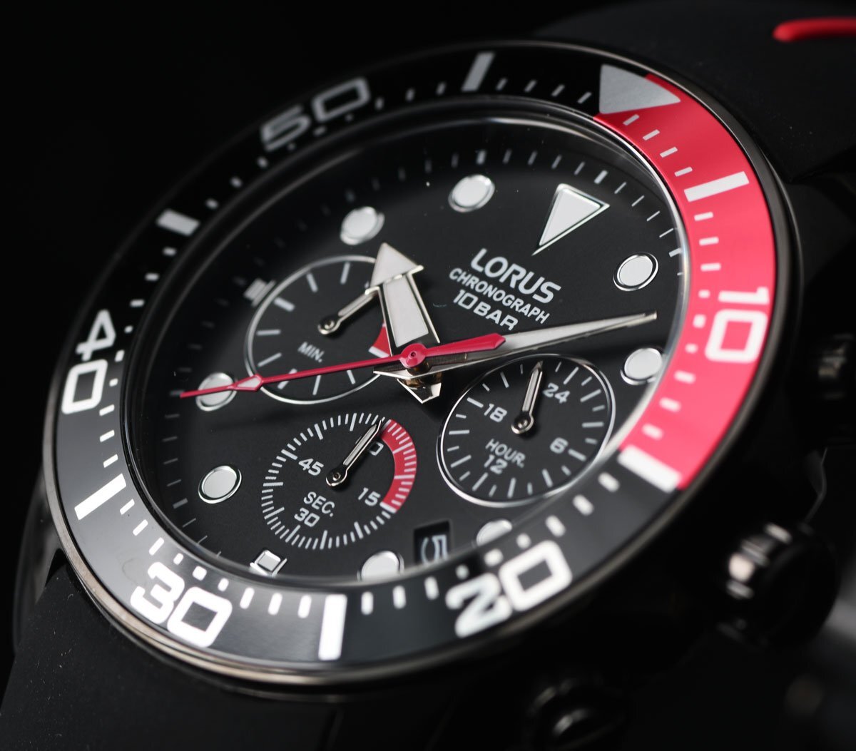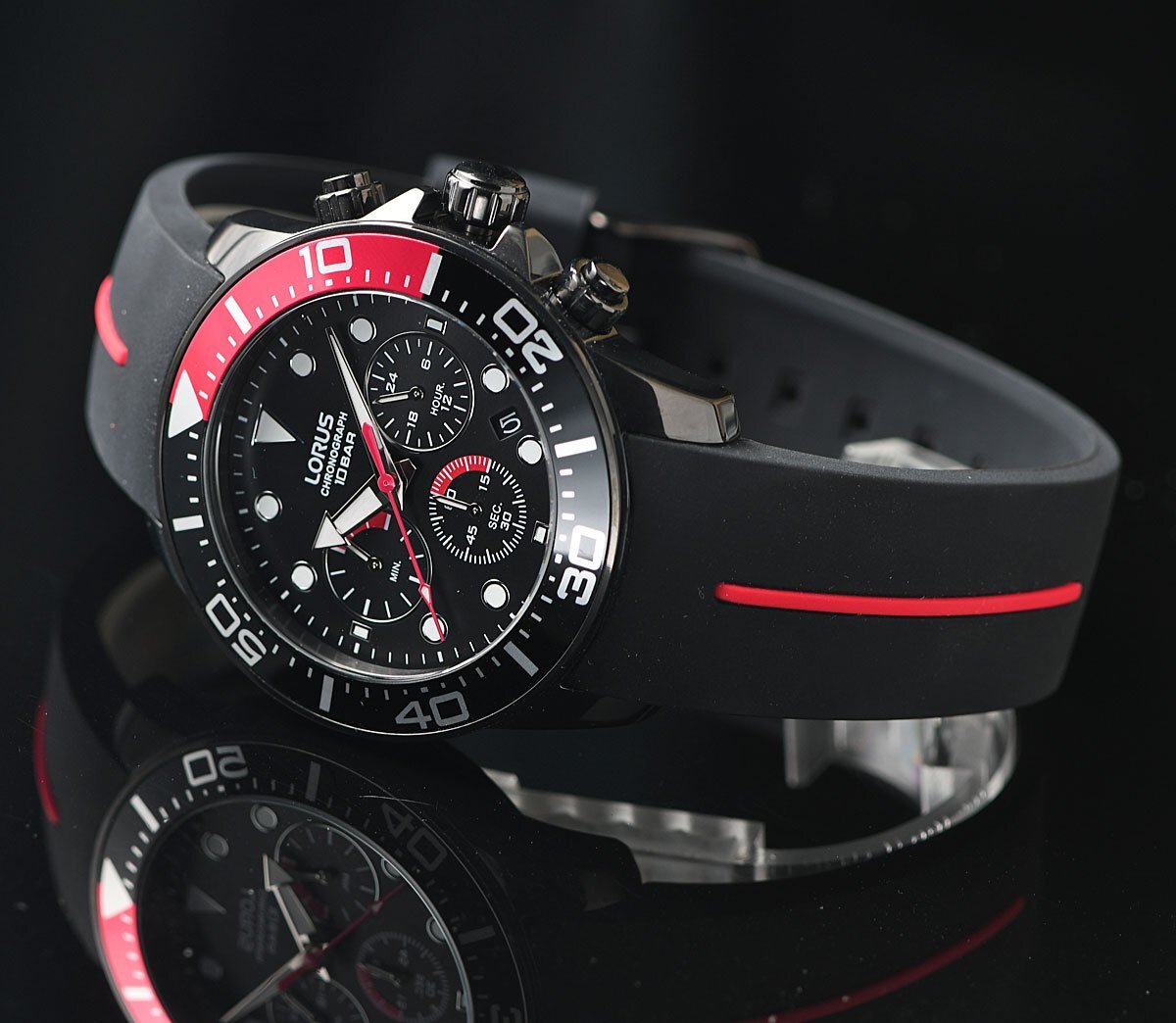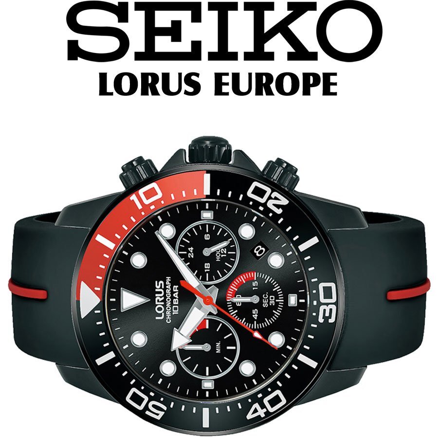 セイコーLORUS 新品 100m防水クロノグラフ 精悍ブラック&レッド 逆輸入 ヨーロッパ 新品メンズ 激レア日本未発売 ローラス