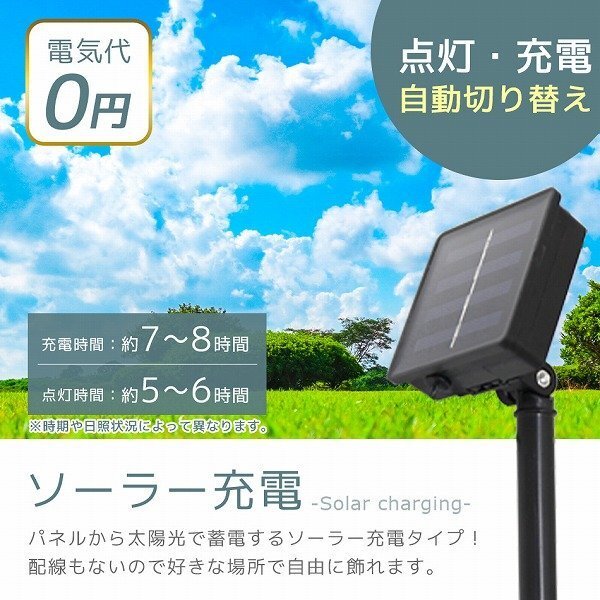 ソーラーパネルで充電するので、電源不要で電気代0円! 経済的でエコなイルミネーションです。 暗くなると自動で点灯、明るくなると自動で消灯する明るさセンサー付きなのでとても便利! 使用しない場合は電源をOFFにしておけば暗くなっても光りません。 電源をコンセントから取らなくていいので、日の当たるソーラーパネルを置くスペースさえあれば どこでも楽しむことが出来ます。 お庭の植え込みに、ラティスやベランダに! クリスマスイルミネーションにピッタリ!ハロウィンもピッタリです♪ 【商品仕様】 種類:スタータイプ サイズ(約): ・ソーラー本体:7.2×7.2×2.3cm ・支柱:21.5cm 重量(約):270g LED数:50球 点灯パターン:2パターン(常時点灯、点滅) 5時間充電で、6時間程度使用可能 ※時間は目安で、使用環境により異なります。 ※環境により充電時間は伸びます。 カラー:ミックスカラー(ブルー、レッド、グリーン、イエロー) ソーラーパネル:2V/100mA バッテリー:ニッケル水素電池(NiMH) 600mAH 電源から電球までの長さ(約):2m コードの長さ(約):7m コードの色:ダークグリーン 防水性能:防水 防滴型 連結不可 【注意事項】 ・水没する可能性のある場所では、使用しないで下さい。 ・夜間、周囲が明るくなる場所に設置すると、照度センサーが感知せず点灯しない場合があります。 ・LED不良率5%以下につきましては保証対象外とさせていただきます。 ・入荷時期により、多少色味が異なる場合がございます。初期不良対象外となりますのでご了承下さい。 ・写真と実物は多少異なる場合がございます。あらかじめご了承下さい。 |