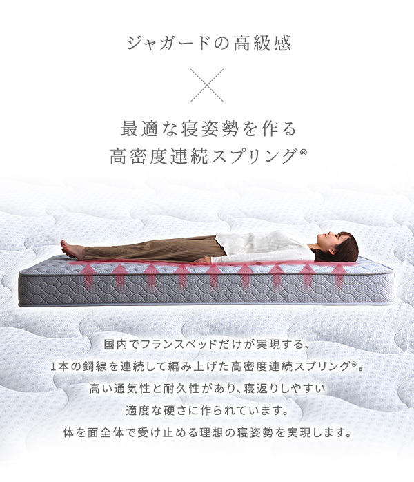 フランスベッドだけが作れる1本の鋼線を連続して編み上げた高密度連続スプリングは、高い通気性と耐久性、寝返りしやすい適度な硬さ、体を面全体で受け止める理想の根姿勢を実現。